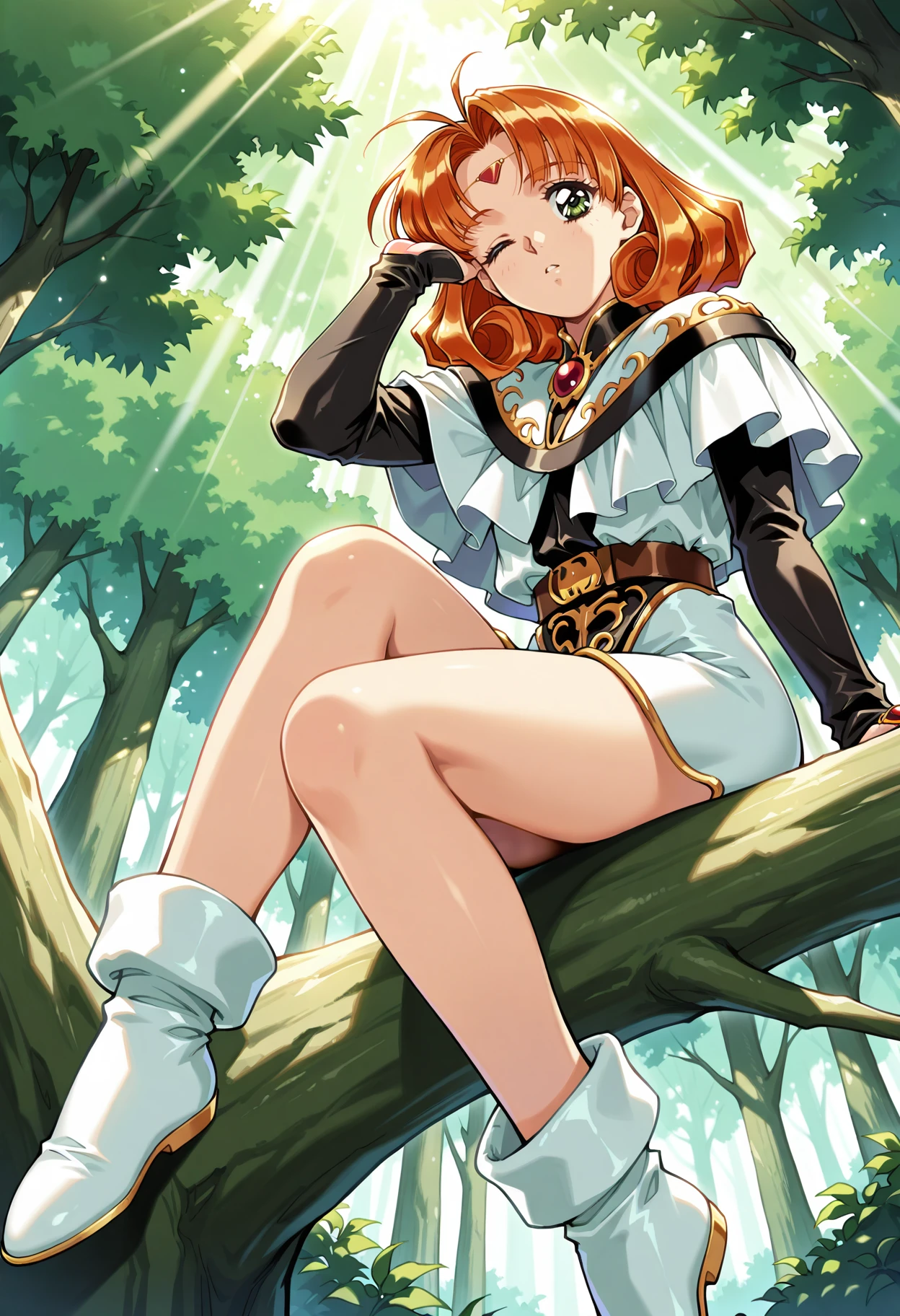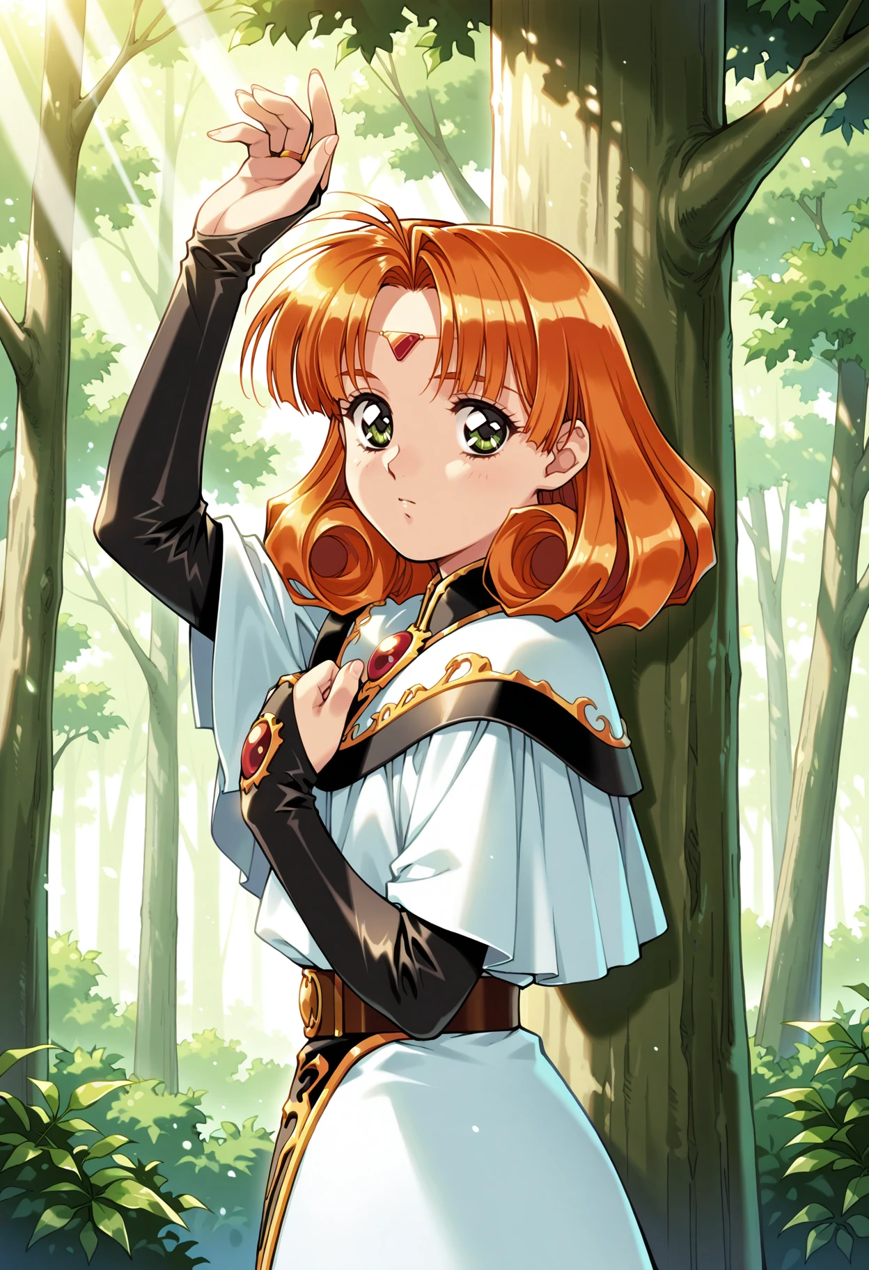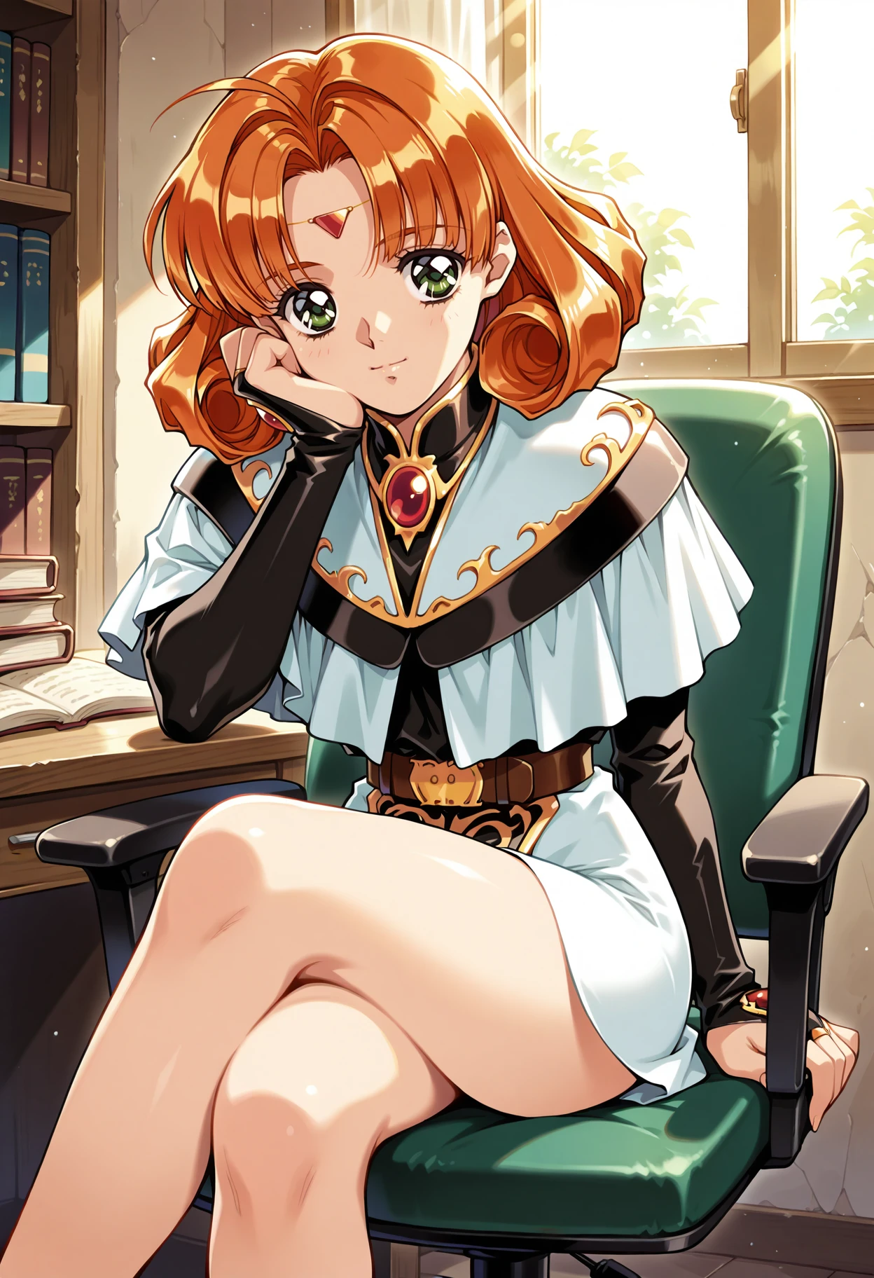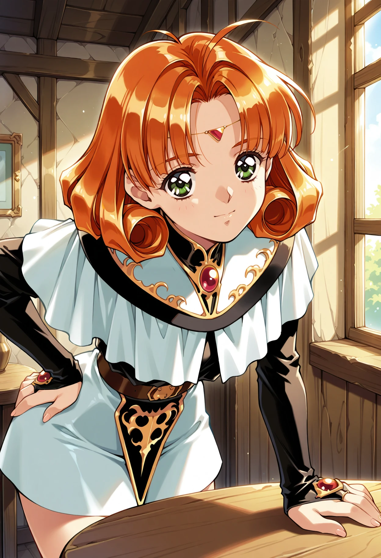 Base: dk4natasha, retro artstyle, 1girl, solo, short hair, curly hair, orange hair, natasha circlet, green eyes, natasha capelet, long sleeves, white natasha skirt, bridal gauntlets, belt, brooch, jewelry,