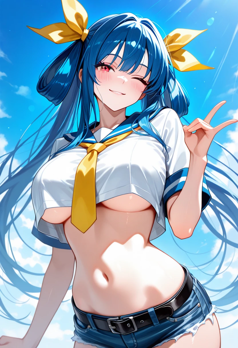 "GGSTRVDZY, blue hair,long hair, hair flower, red eyes, white cropped vest, elbow gloves, fingerless gloves, black skirt, dress flower,"