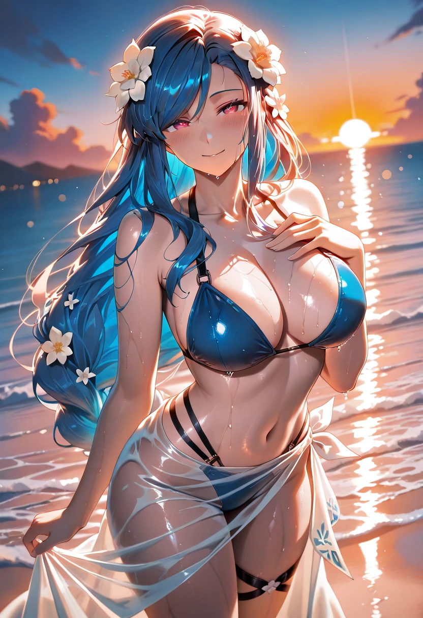 GGSTRVDZY, blue hair,long hair, hair flower, red eyes, white cropped vest, elbow gloves, fingerless gloves, black skirt, dress flower,