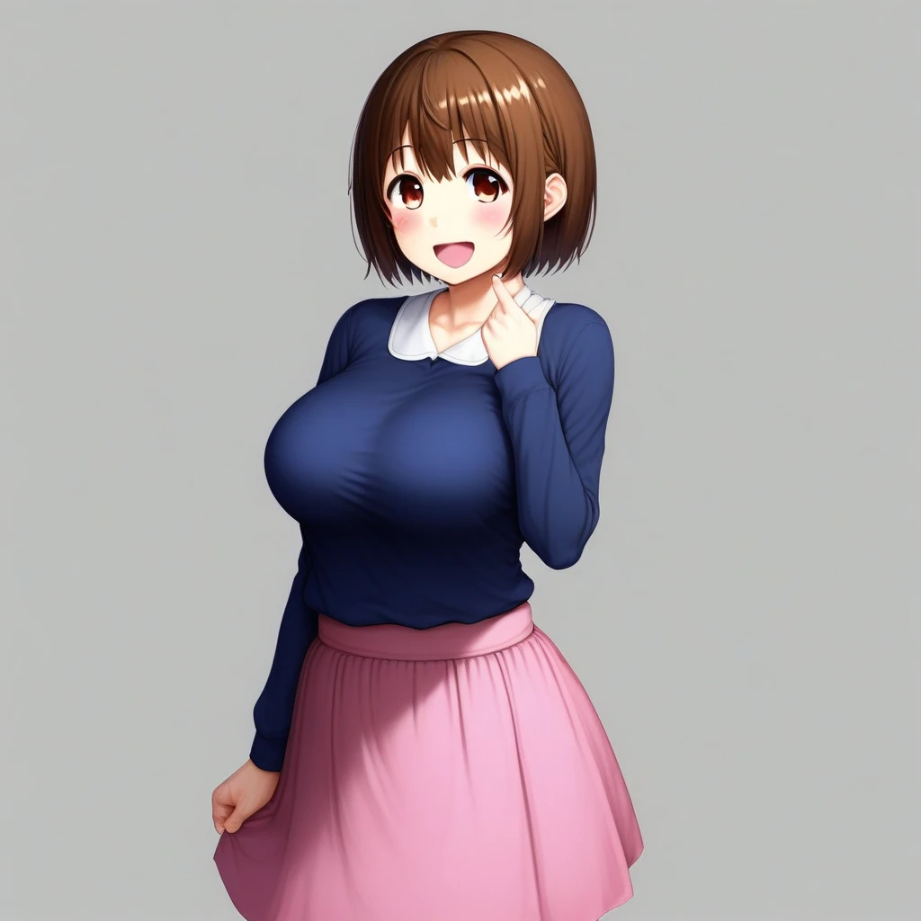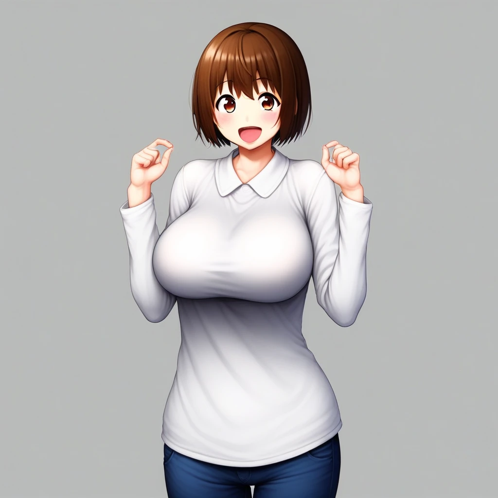 brown hair,bob cut,bangs,brown eyes,tareme,tall height,large breasts
