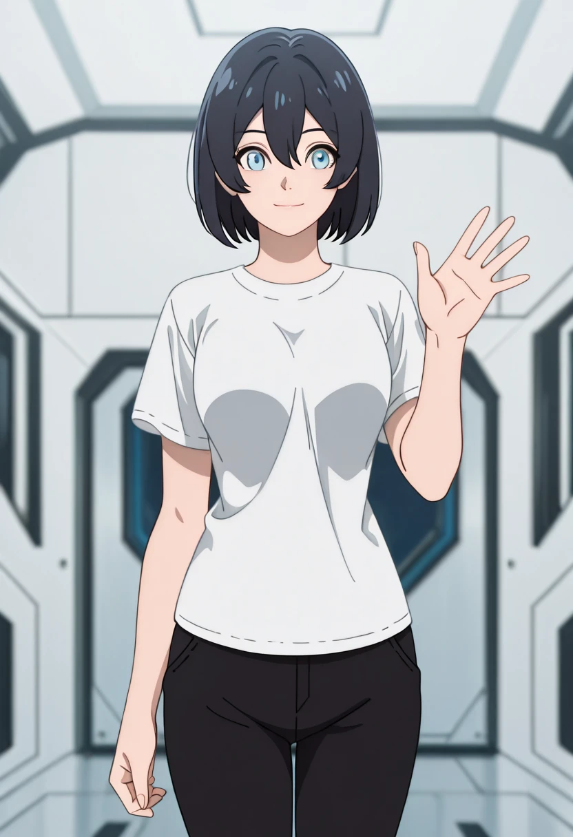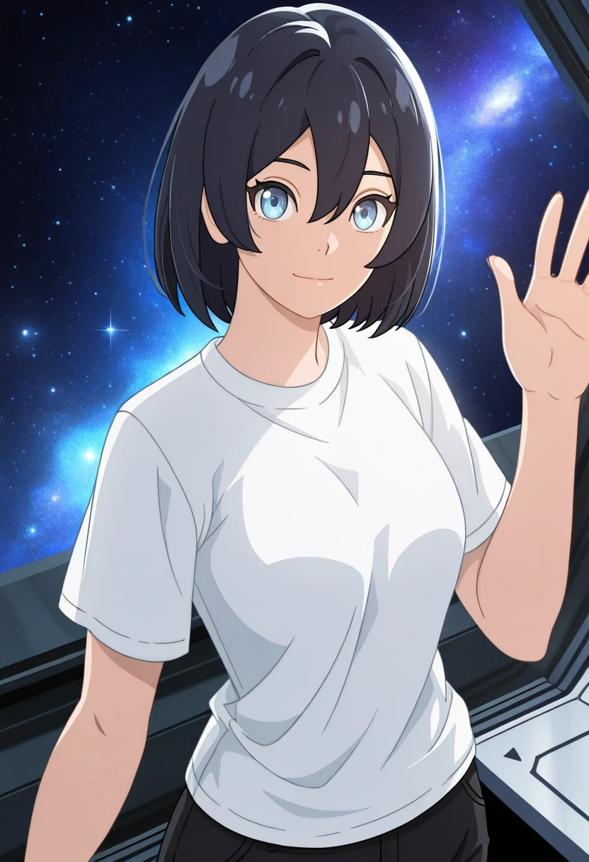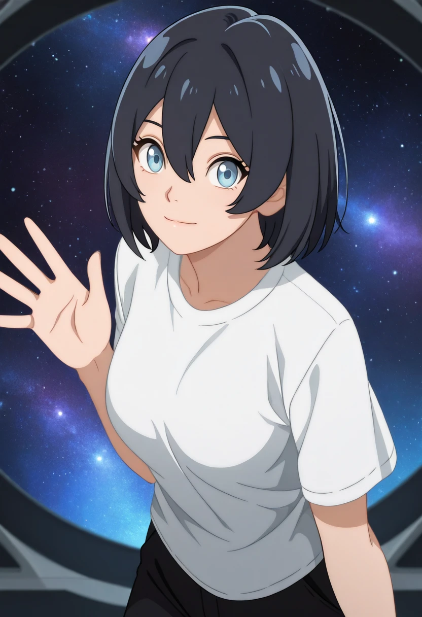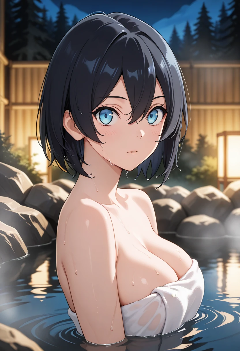 1girl, solo blue eyes, short hair, black hair, hair between eyes, medium breast