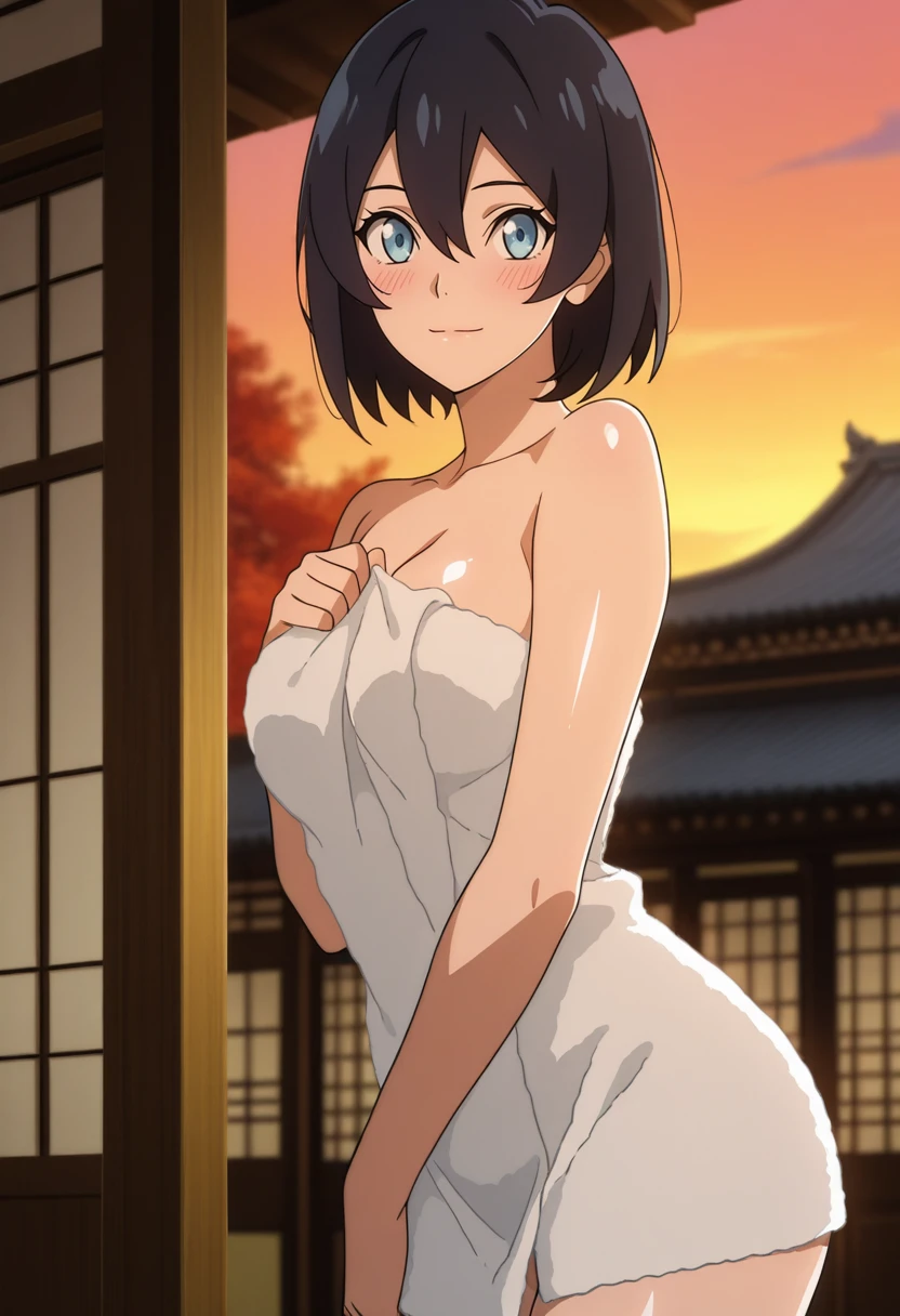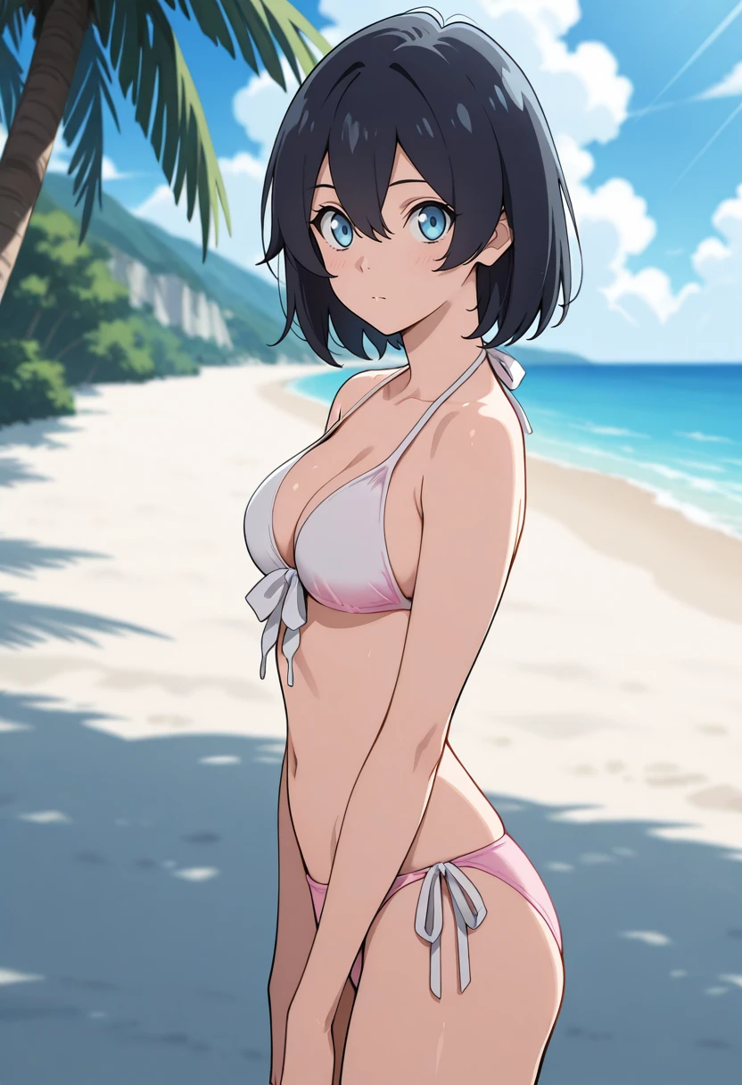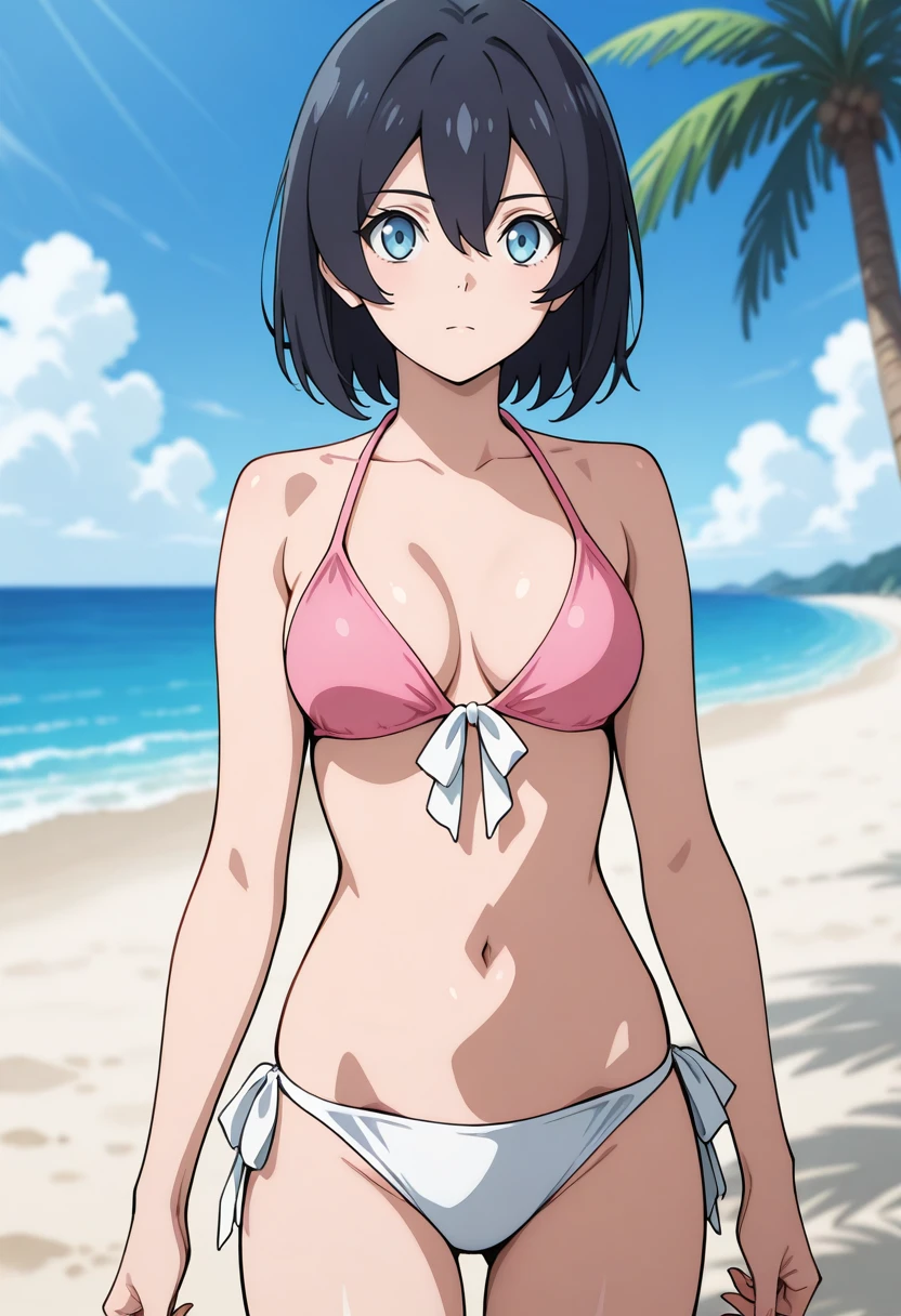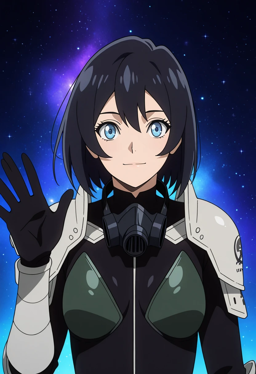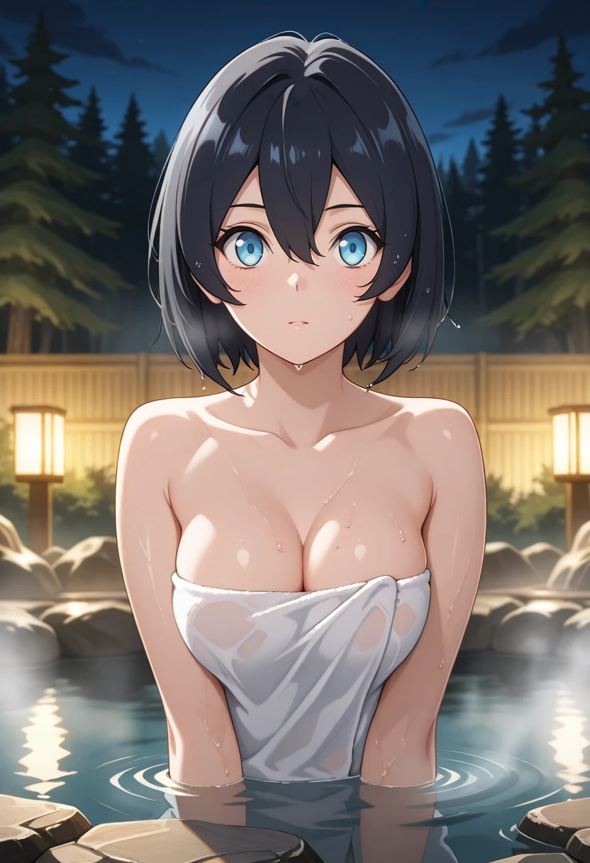 1girl, solo blue eyes, short hair, black hair, hair between eyes, medium breast
