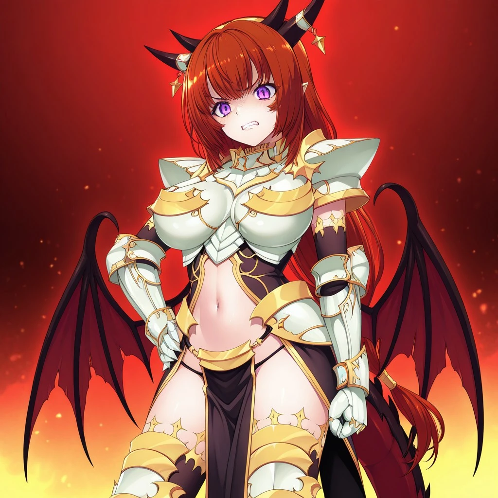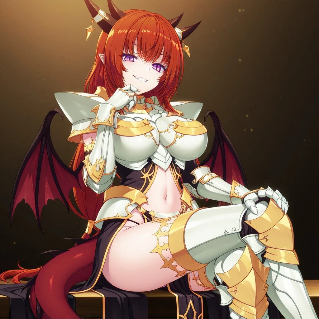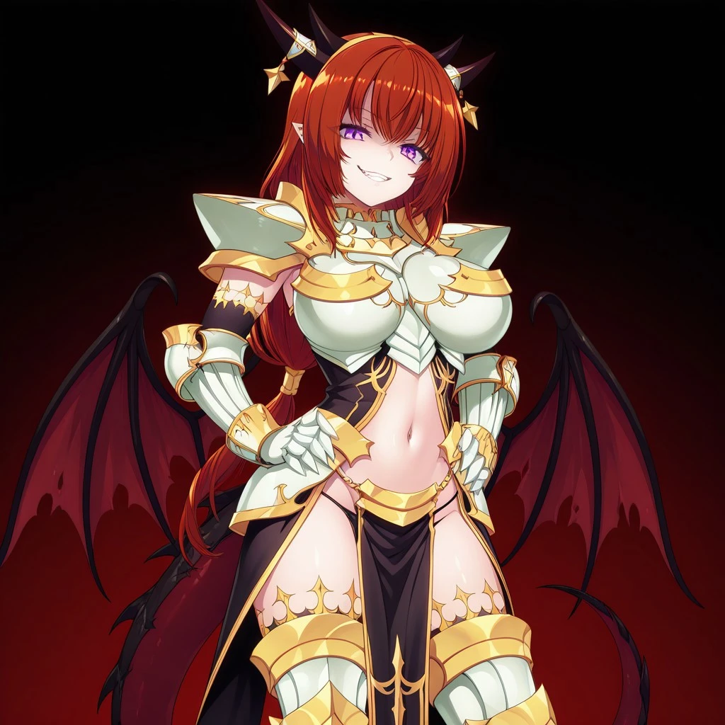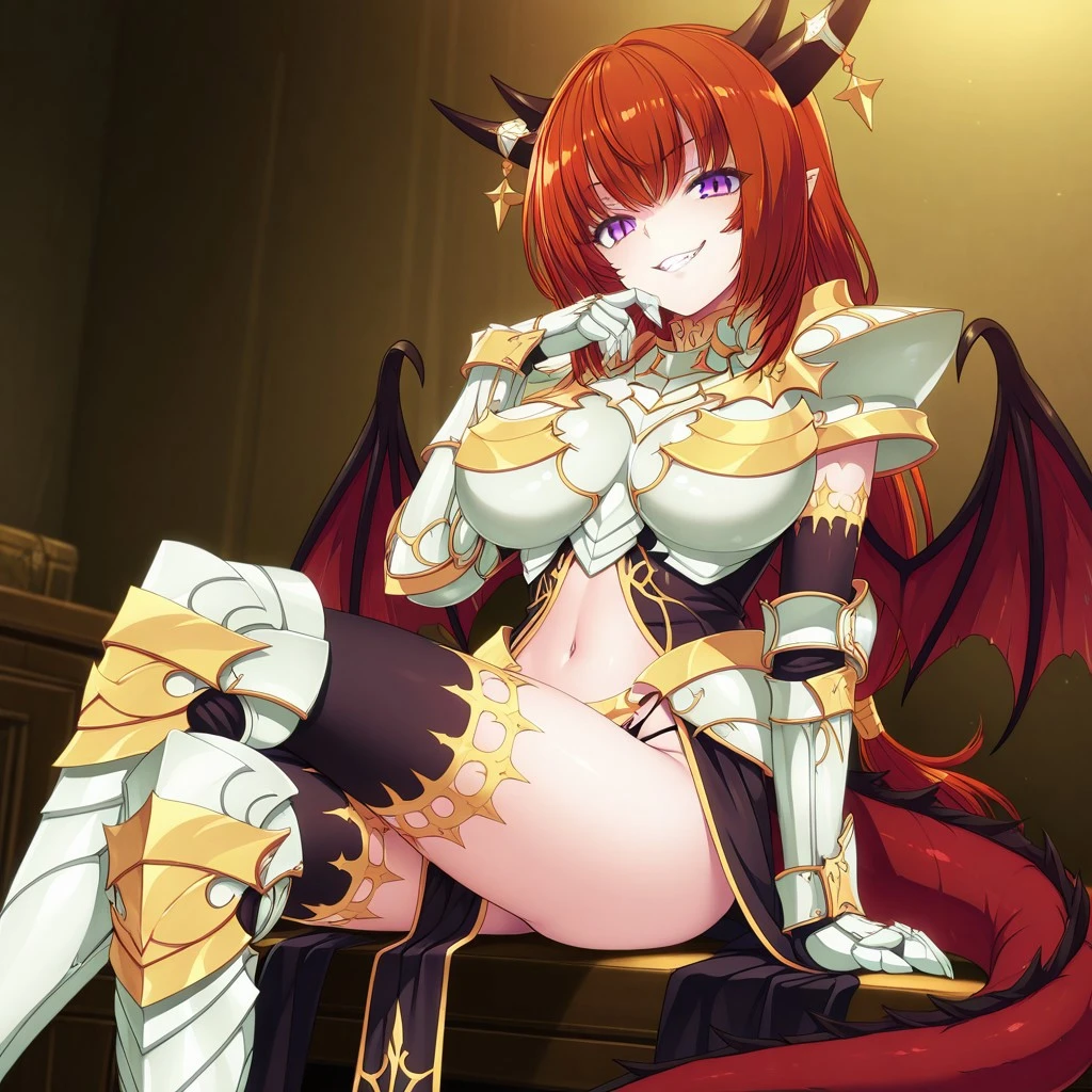 Character: 1girl, red hair, long hair, low tied hair, golden hairband, horns, purple eyes, slit pupils, dragon tail, small dragon wings, pointy ears, large breasts,