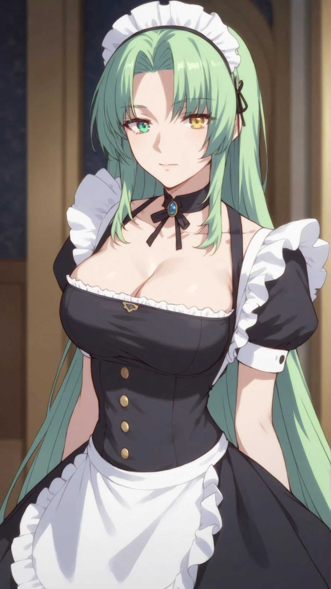 elletear, an anime girl, 1girl, solo, long hair, breasts, large breasts, cleavage, green eyes, green hair, heterochromia, maid,