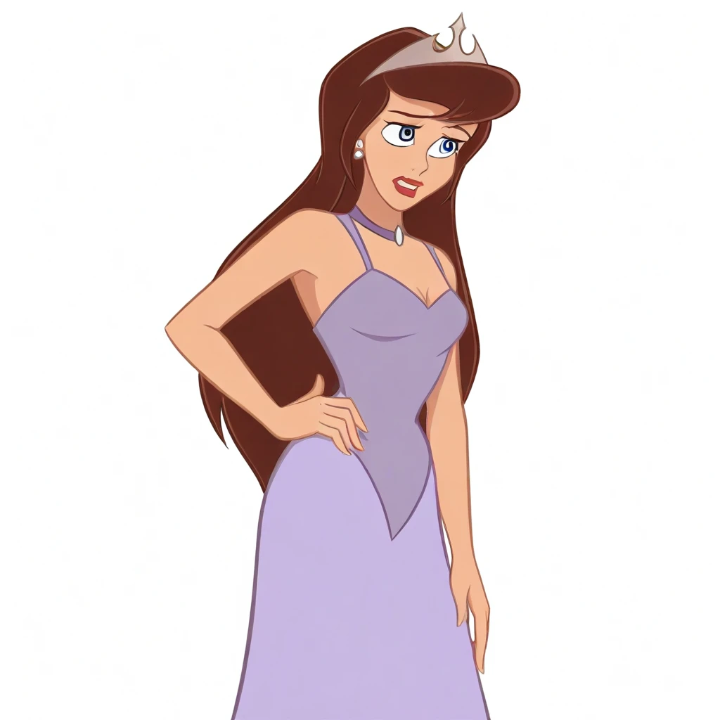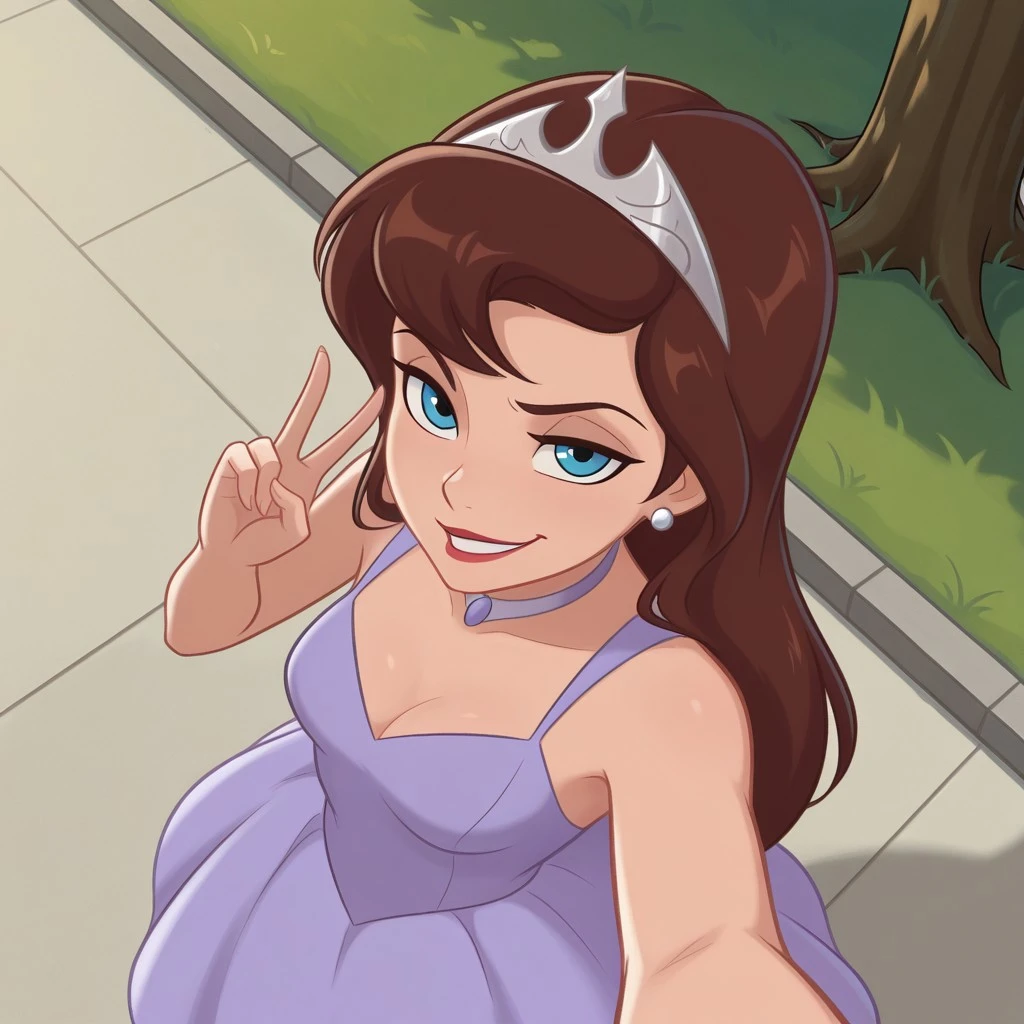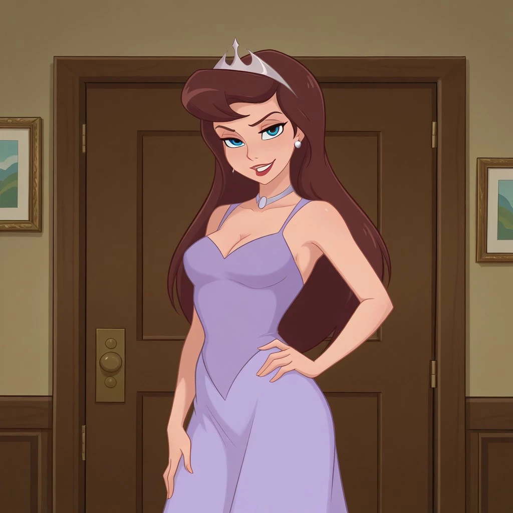 cla_dt, brown hair, long hair, tiara, earrings, blue eyes, dress, lipstick