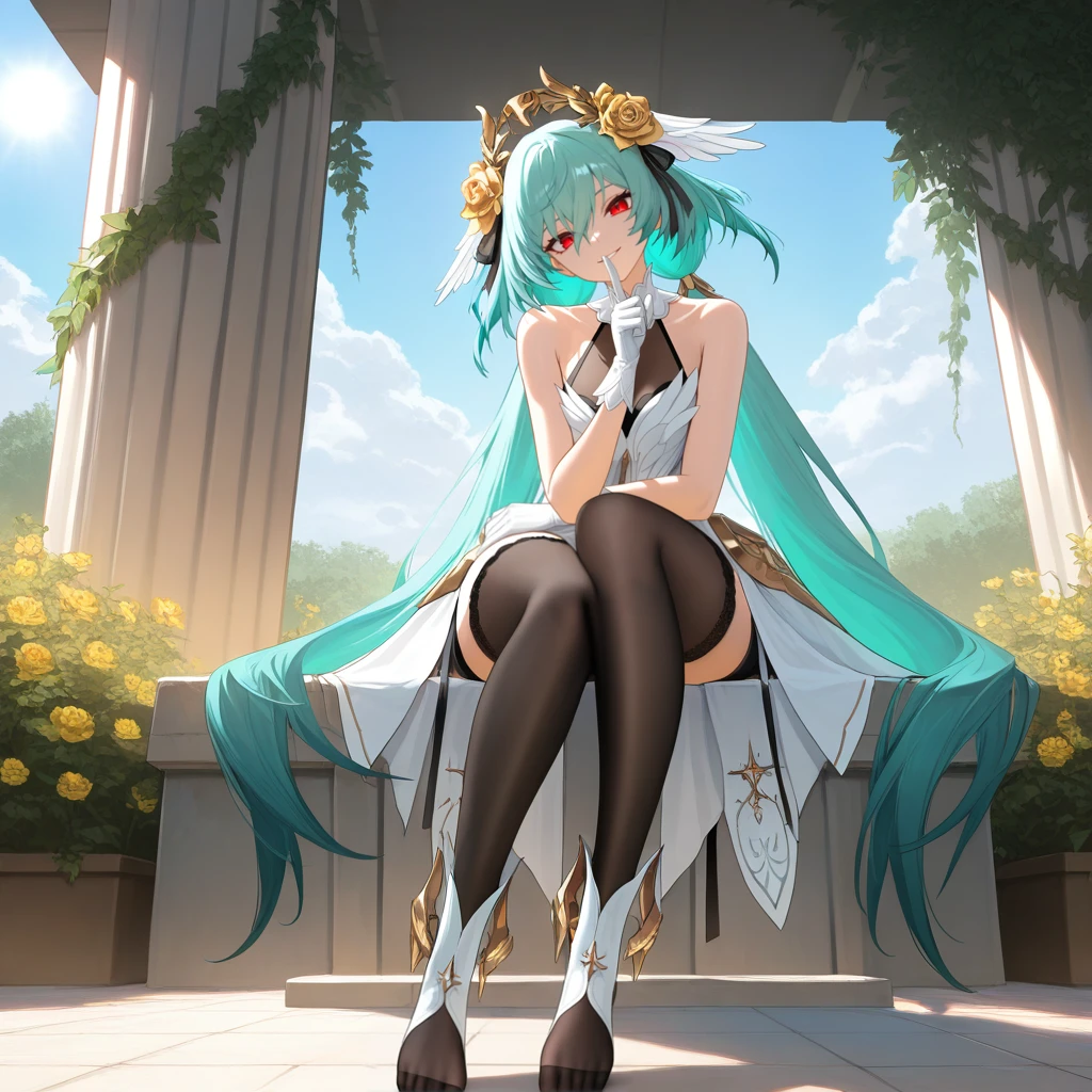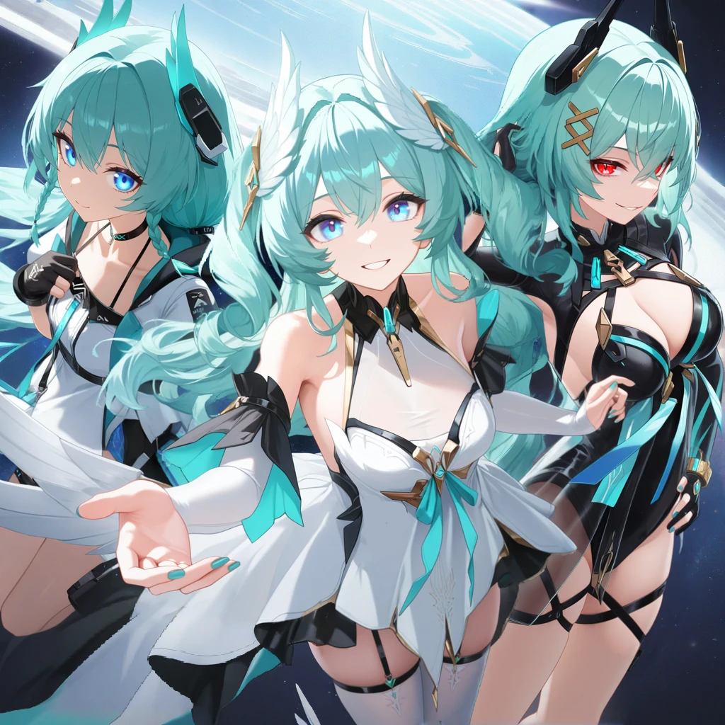 OsrAusAG, Osr_New, wavy hair, two side up, aqua hair, light blue eyes, long hair, sleeveless dress, alternate white dress, black gorget, bare shoulders, aqua ribbon, elbow gloves, ankle wings, two-sided skirt, waist cape, black trim, head wings, black sleeves, two-sided gloves, white thighhighs, thighhighs, bridal legwear, black garter straps, detached sleeves, see-through cleavage, multiple thigh straps, black thigh strap, white bodystocking,Chinese Outfit: