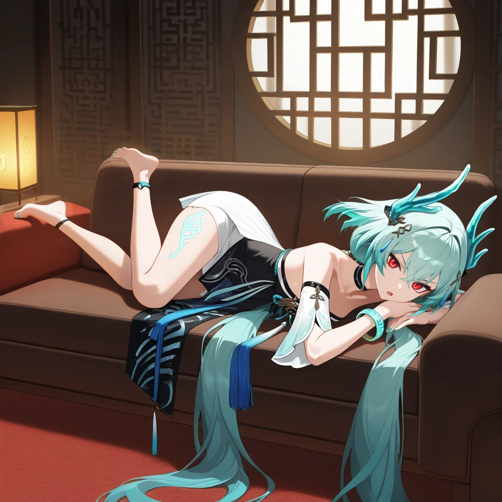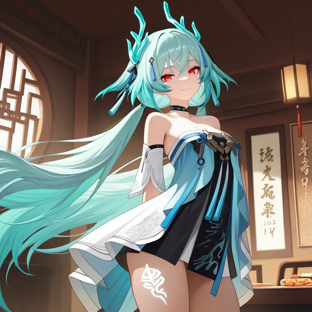 OsrAusAG, Osr_CN, red eyes, aqua hair, low twintails, very long hair, chinese clothes, miniskirt, strapless dress, emblem, blue tassel, light blue tassel, blue stole, black dress, print dress, leg tattoo, vertical stripe, single stripe, high-waist skirt, open skirt, white skirt, blue rope, detached sleeves, white sleeves, short sleeves, gradient sleeves, multiple bracelets, black choker, tassel hair ornament, horns, coral horns, ankle strap, bare shoulders,Osiris / Ausar v1.0 (Pony)