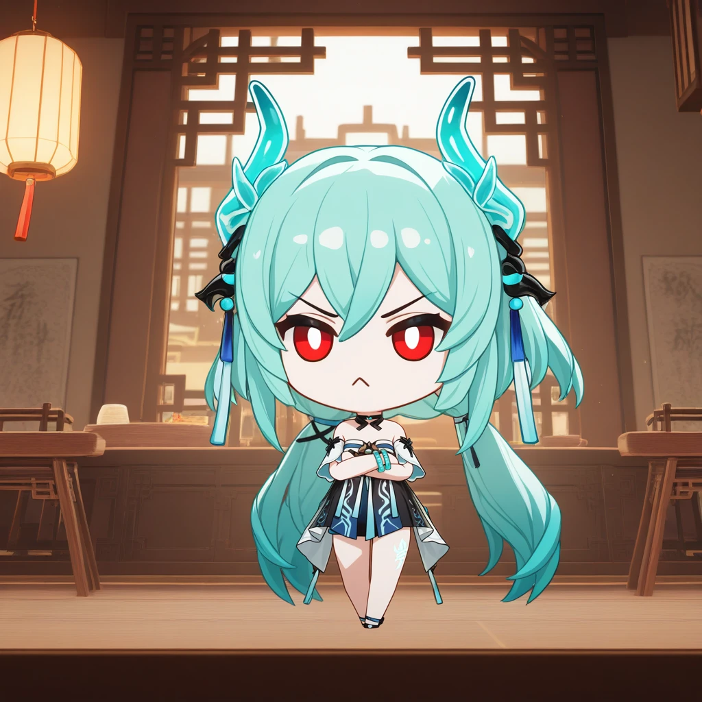 Osiris, Osir_CN, aqua hair, red eyes, very long hair, low twintails, coral hair ornament, black choker,Chinese Outfit: