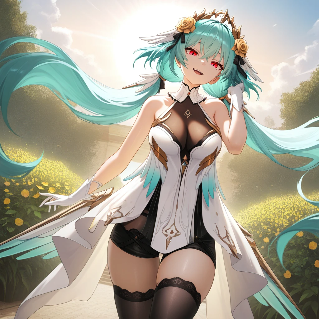 OsrAusAG, Osr_New, wavy hair, two side up, aqua hair, light blue eyes, long hair, sleeveless dress, alternate white dress, black gorget, bare shoulders, aqua ribbon, elbow gloves, ankle wings, two-sided skirt, waist cape, black trim, head wings, black sleeves, two-sided gloves, white thighhighs, thighhighs, bridal legwear, black garter straps, detached sleeves, see-through cleavage, multiple thigh straps, black thigh strap, white bodystocking, aqua toenails,Japanese Outfit: