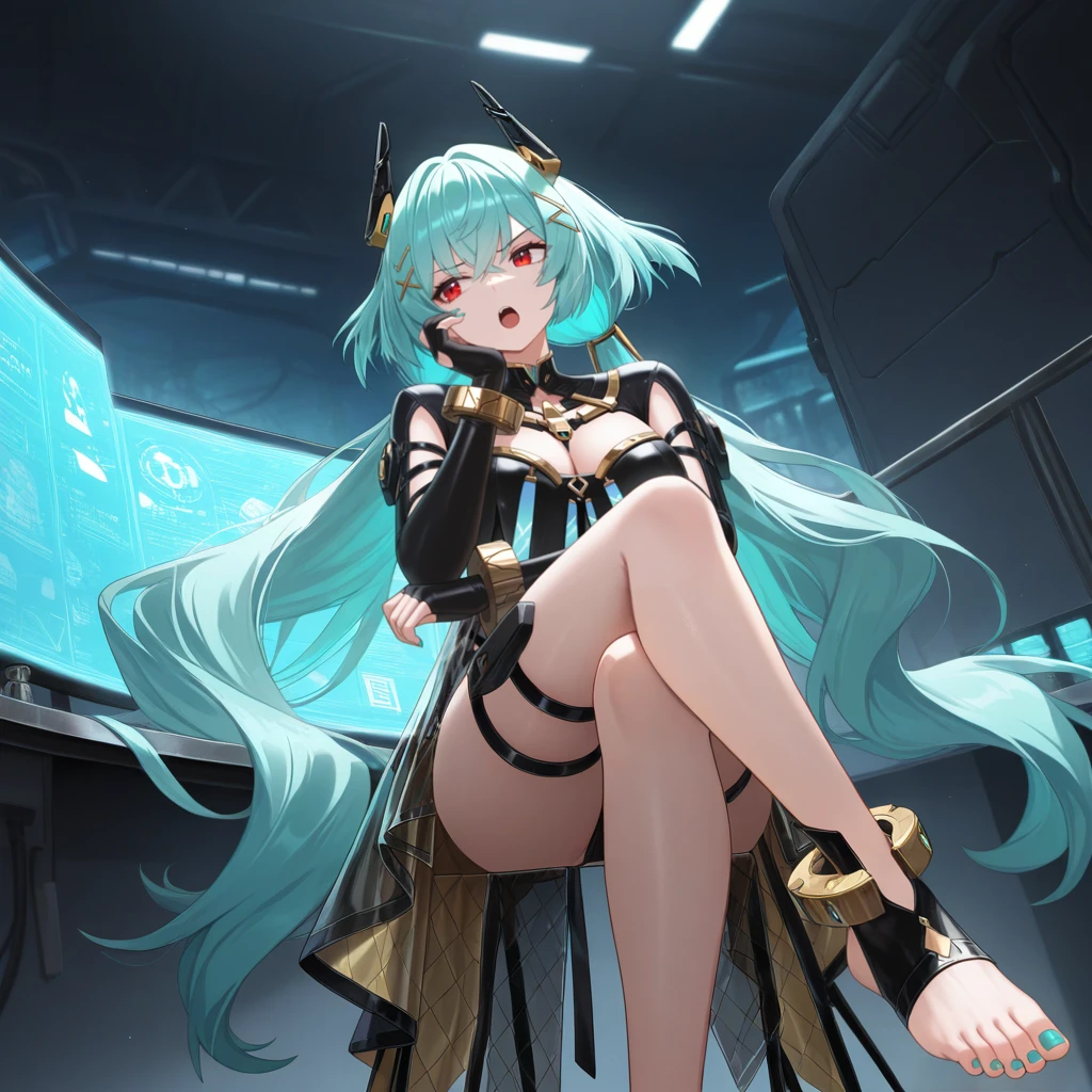 OsrAusAG, Osr_Aus, red eyes, aqua hair, low twintails, very long hair, gold hairclip, x hair ornament, headgear, black shrug, shrug (clothing), sleeves past wrists, bare legs, cleavage, side slit, gold bracelet, jewelry, black leotard, leotard under clothes, clothing cutout, arm strap, light blue stole, highleg leotard, see-through dress, see-through, criss-cross straps, multiple thigh straps, see-through skirt, see-through pelvic curtain, criss-cross thigh straps, leotard, half-sleeves, partially fingerless gloves, gloved sleeves, long sleeves, black sleeves, armpit cutout, arm cutout, bare arms, stirrup legwear, black toeless footwear, aqua nails, nail polish,Angel Outfit: