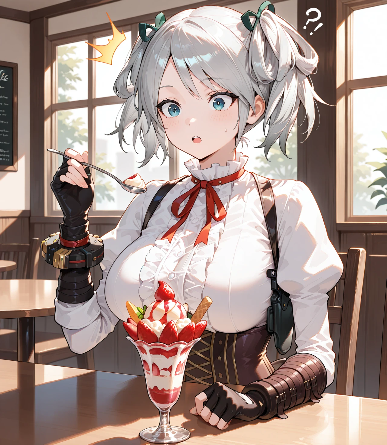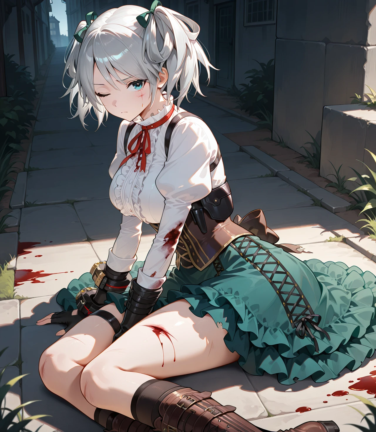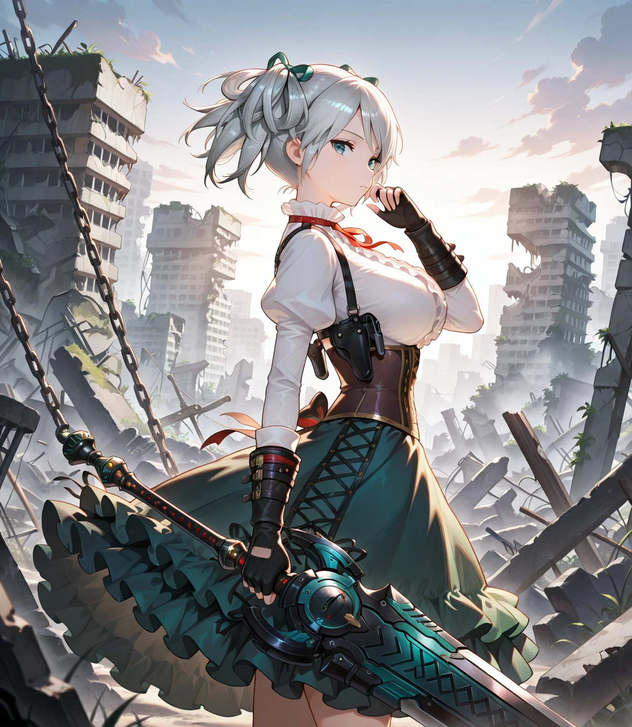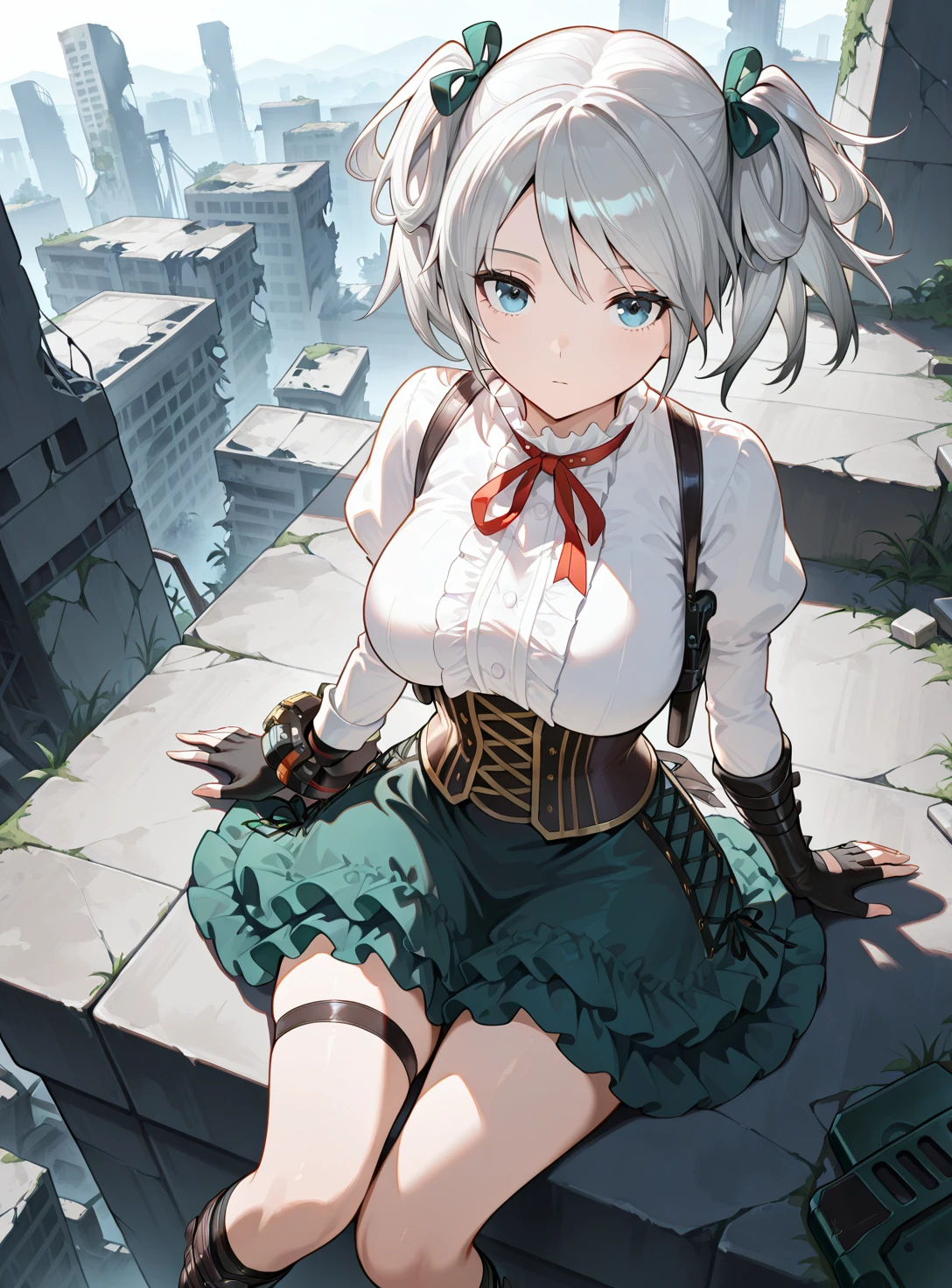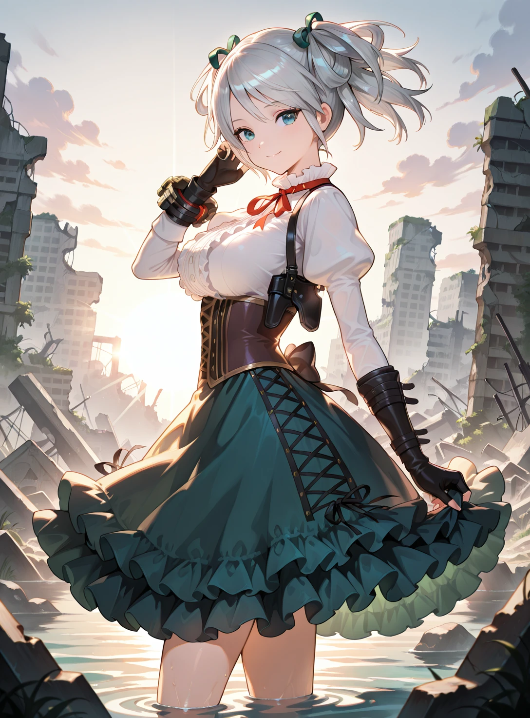 Ciel Alencon, two side up, white shirt, corset, shoulder holster, fingerless gloves, single bracer, layered skirt, single thigh strap,
