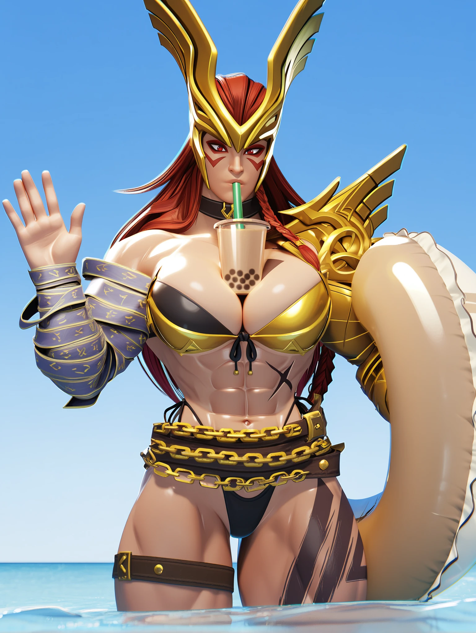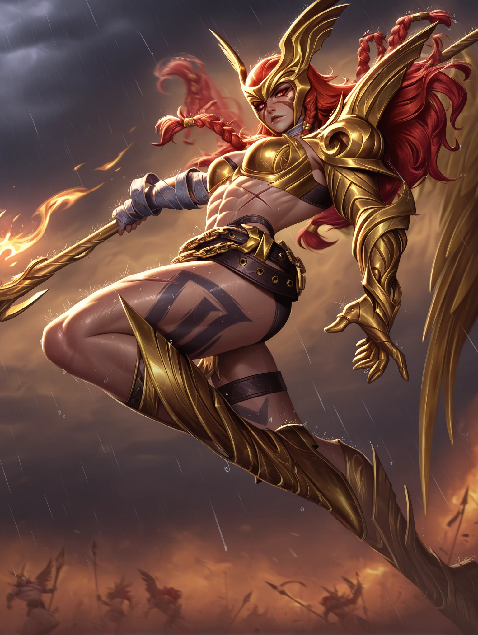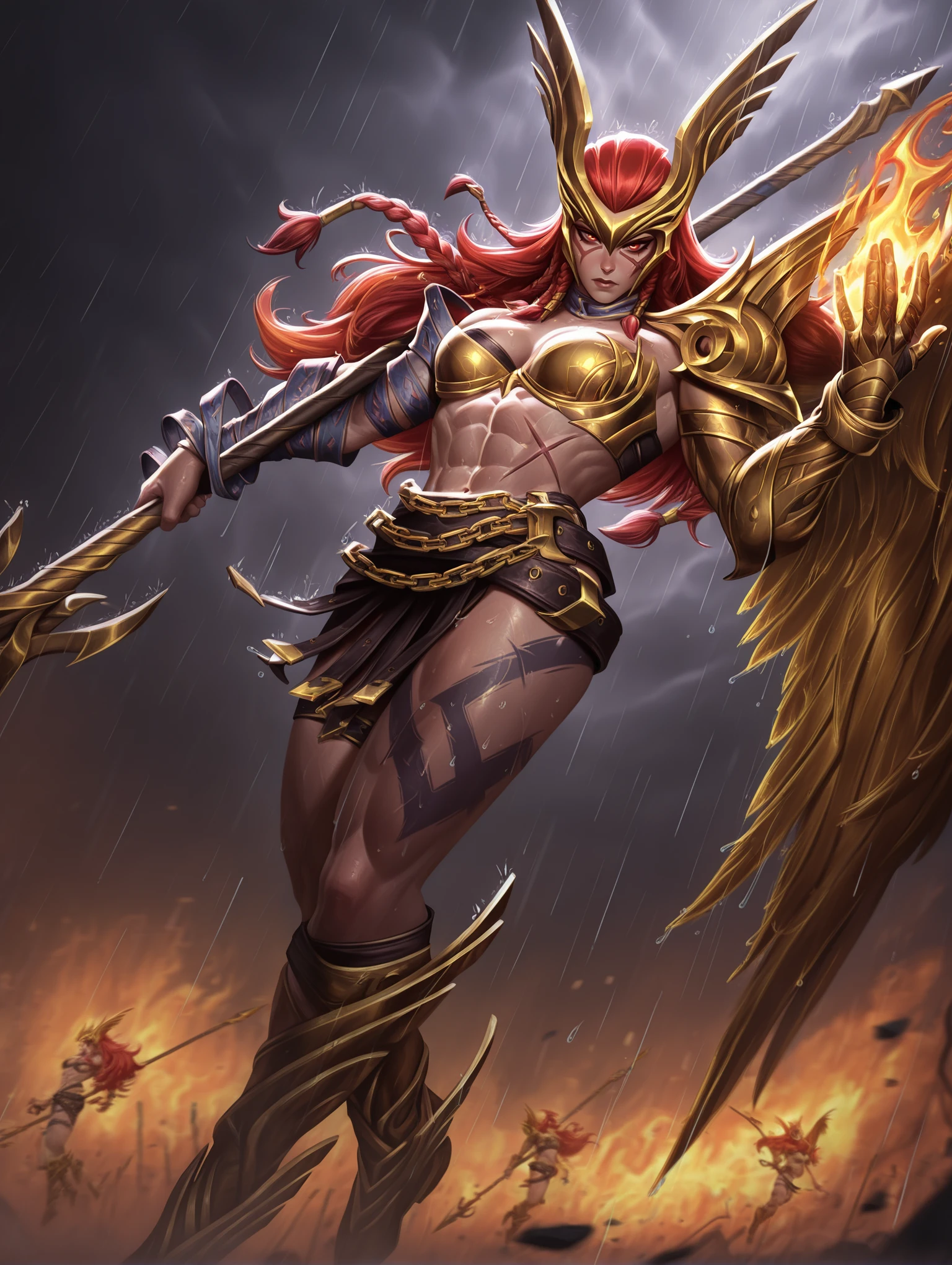 Outfit: gold armor, bikini armor, belt, arm wrap, winged helmet, shoulder armor, chain, single gauntlet, single pauldron, boots,