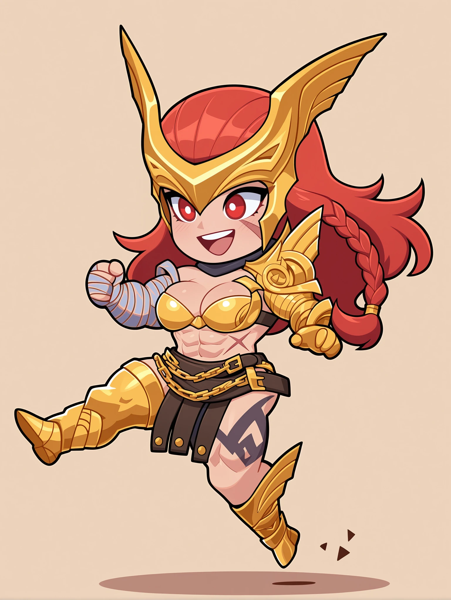 Appearance: angelamarvelrivals, red eyes, red hair, braid, long hair, muscular female, abs, tattoo, scar,