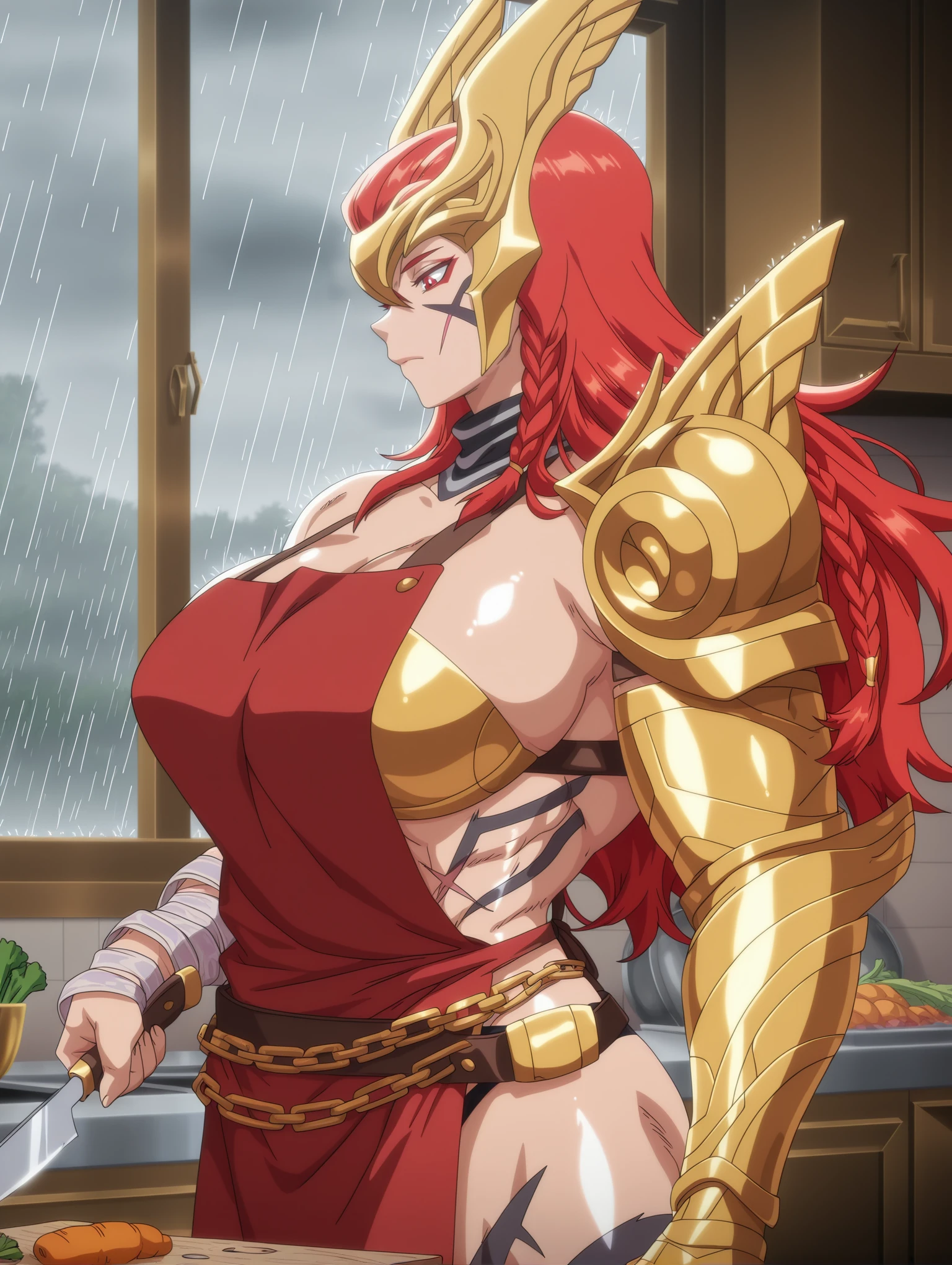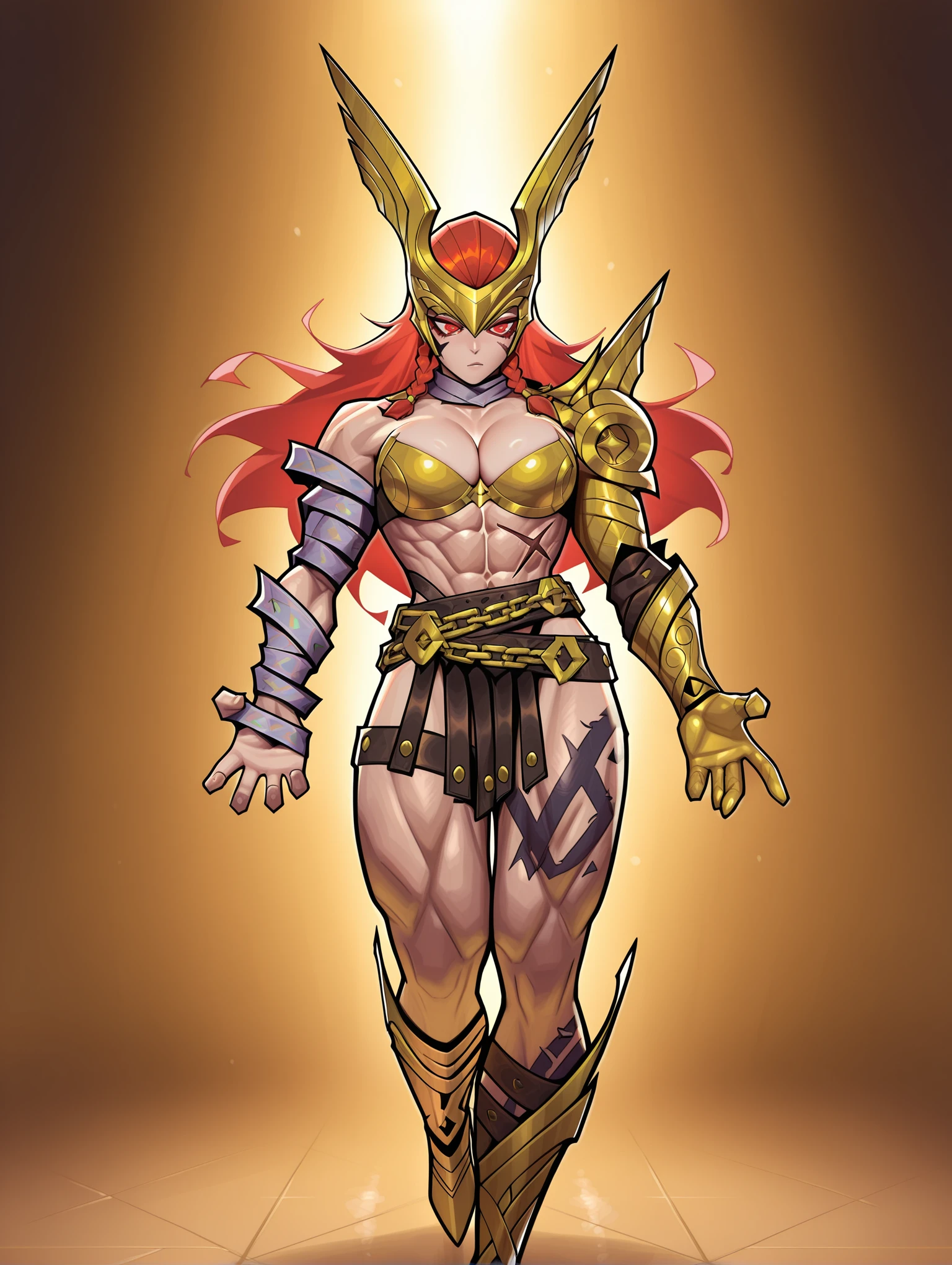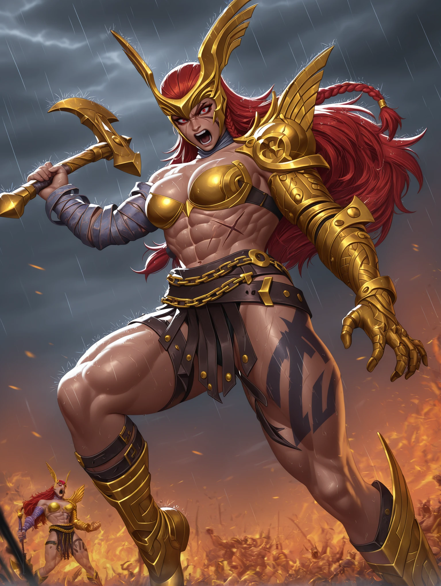 angelamarvelrivals, red eyes, red hair, braid, long hair, muscular female, abs, tattoo, scar,