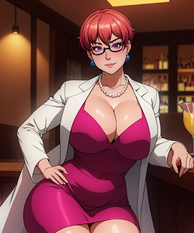 Dress: AkihoRedDress, pearl_necklace, magenta_dress, long_white_coat, large_pearls,