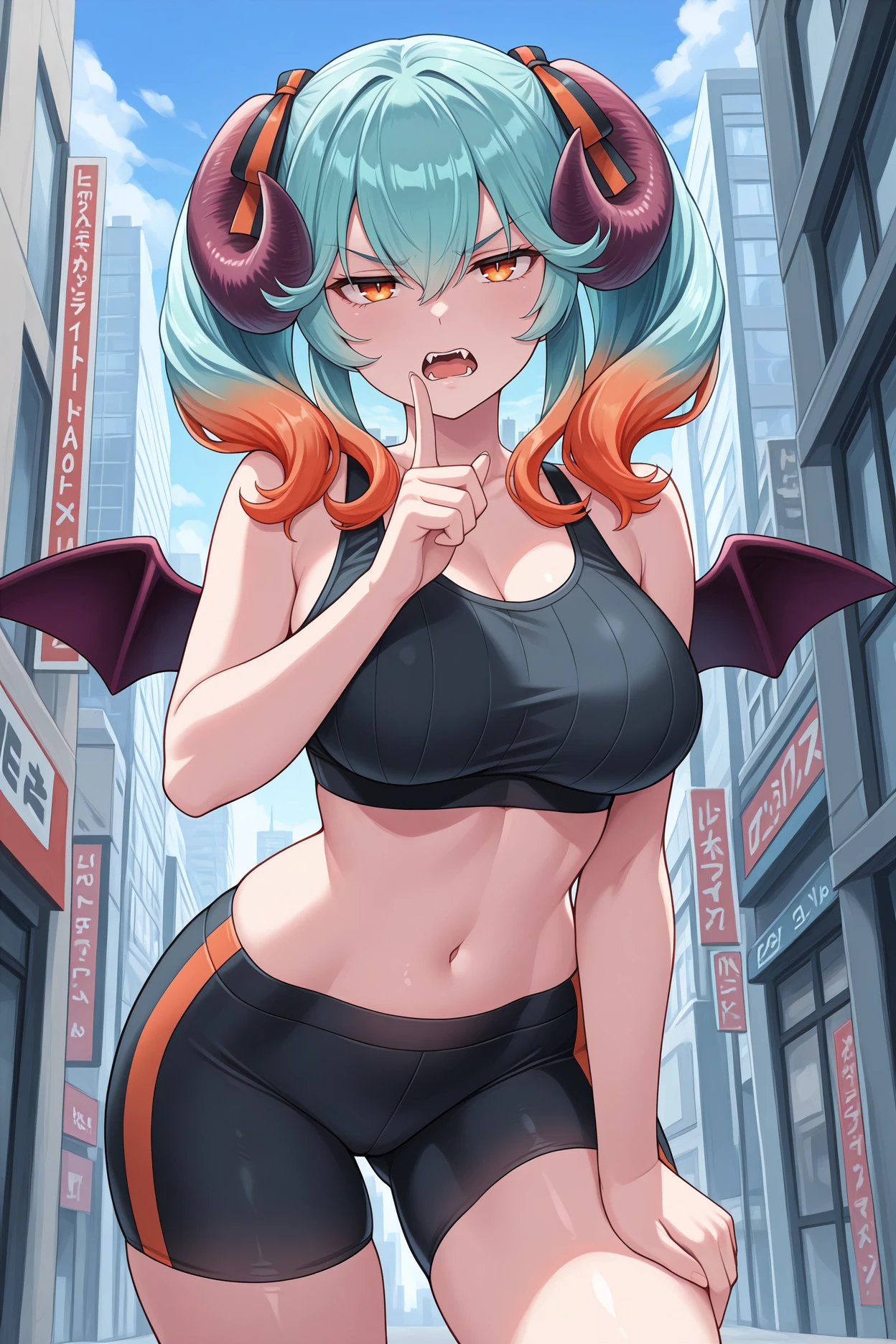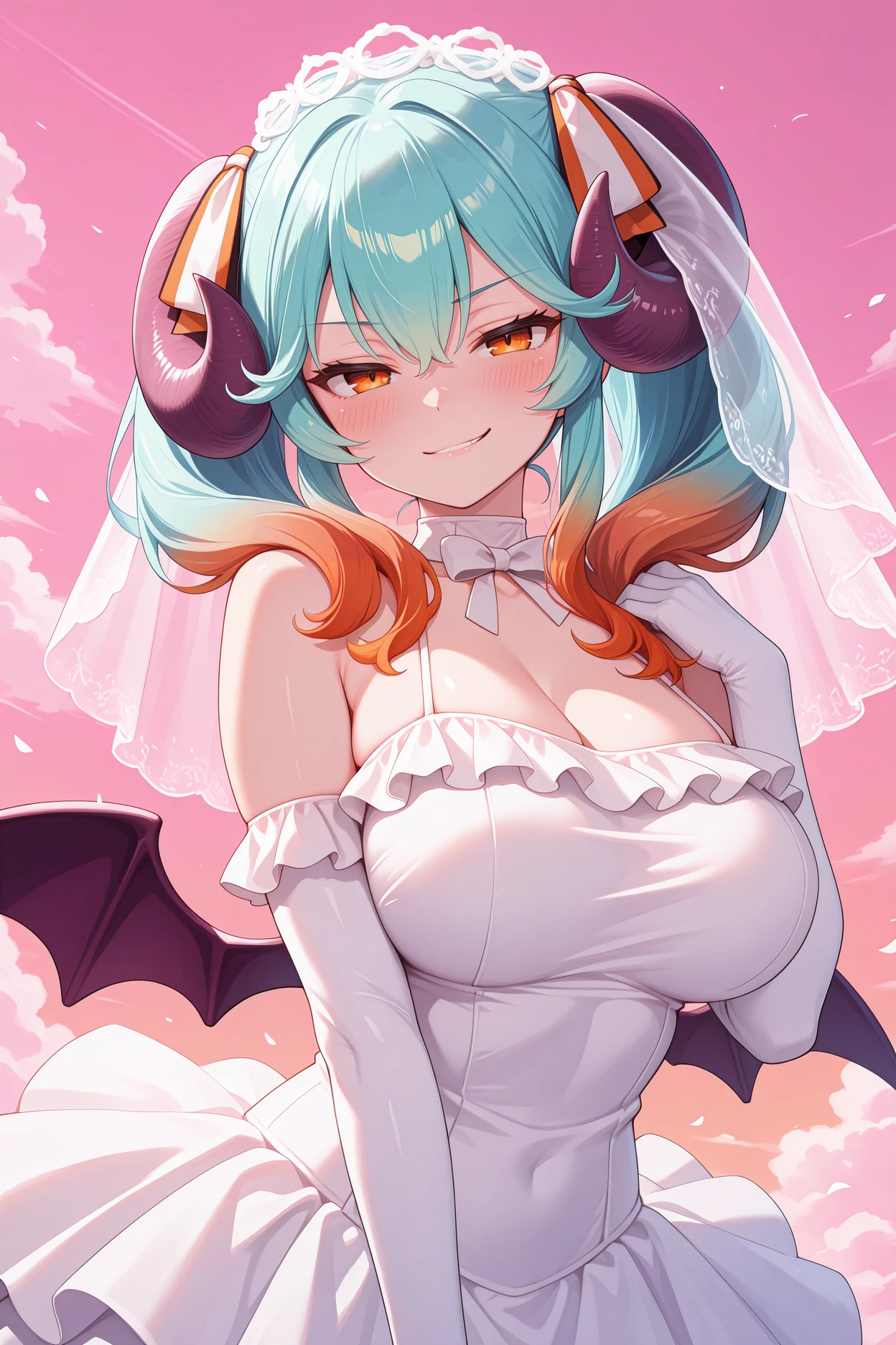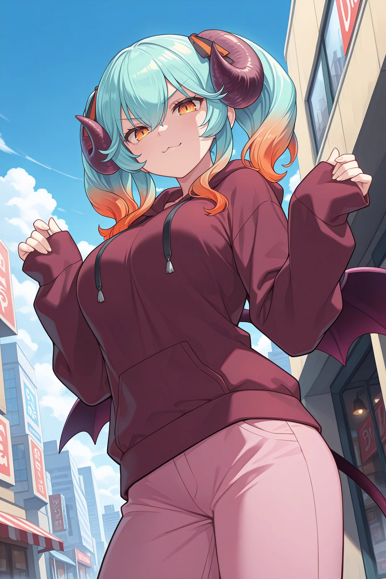 Trigger word is "agslps" and "demon horns, aqua hair, multicolored hair, gradient hair, orange hair, hair between eyes, twintails, amber eyes, demon wings" is required.