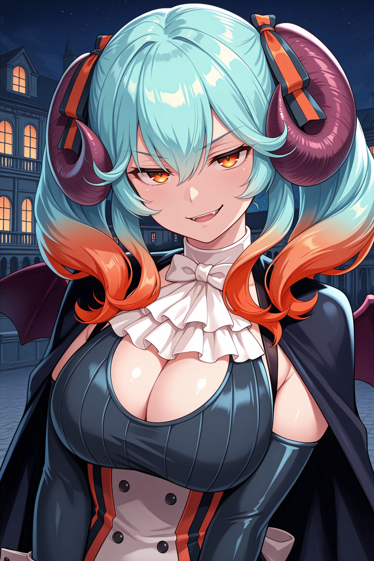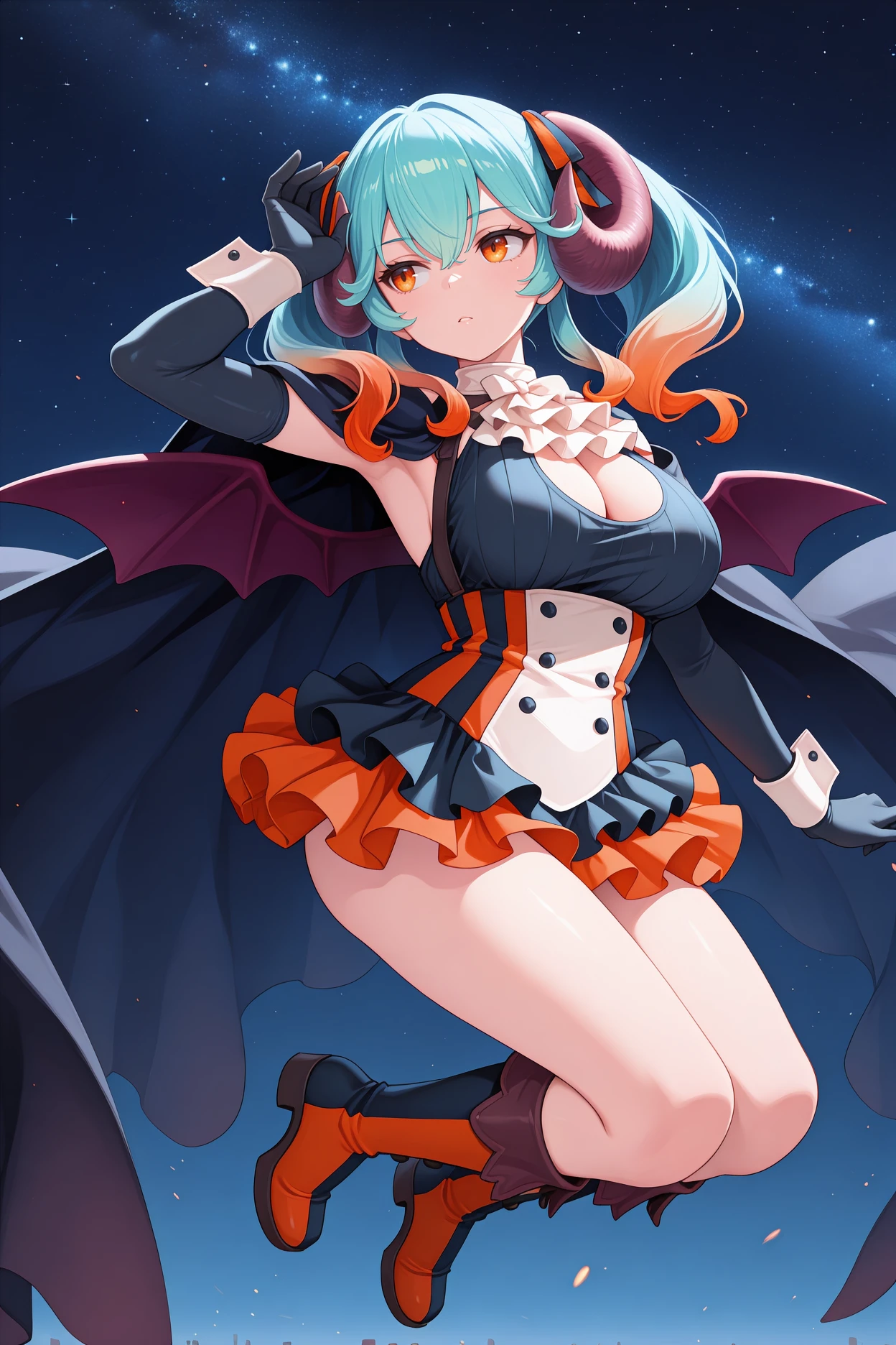 Add "hair ribbon, black cape, white ascot, black dress, short dress, multicolored dress, layered dress, buttons, frilled dress, orange skirt, cleavage cutout, black gloves, elbow gloves, wrist cuffs, orange boots, black boots, multicolored boots, knee boots" for her typical look.