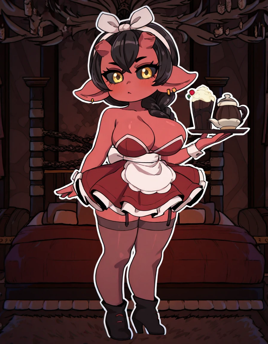 Izzychan,oni horns, skin covered horns, black hair, braided ponytail, imp, red-skinned female, short stack, imp, pointy ears, black sclera, yellow eyes, hairband, hair bow,