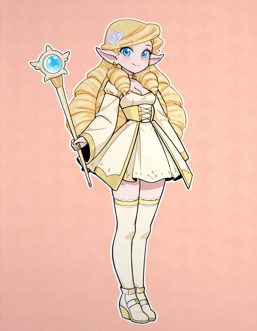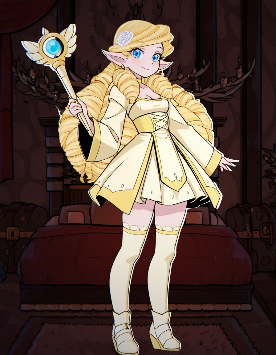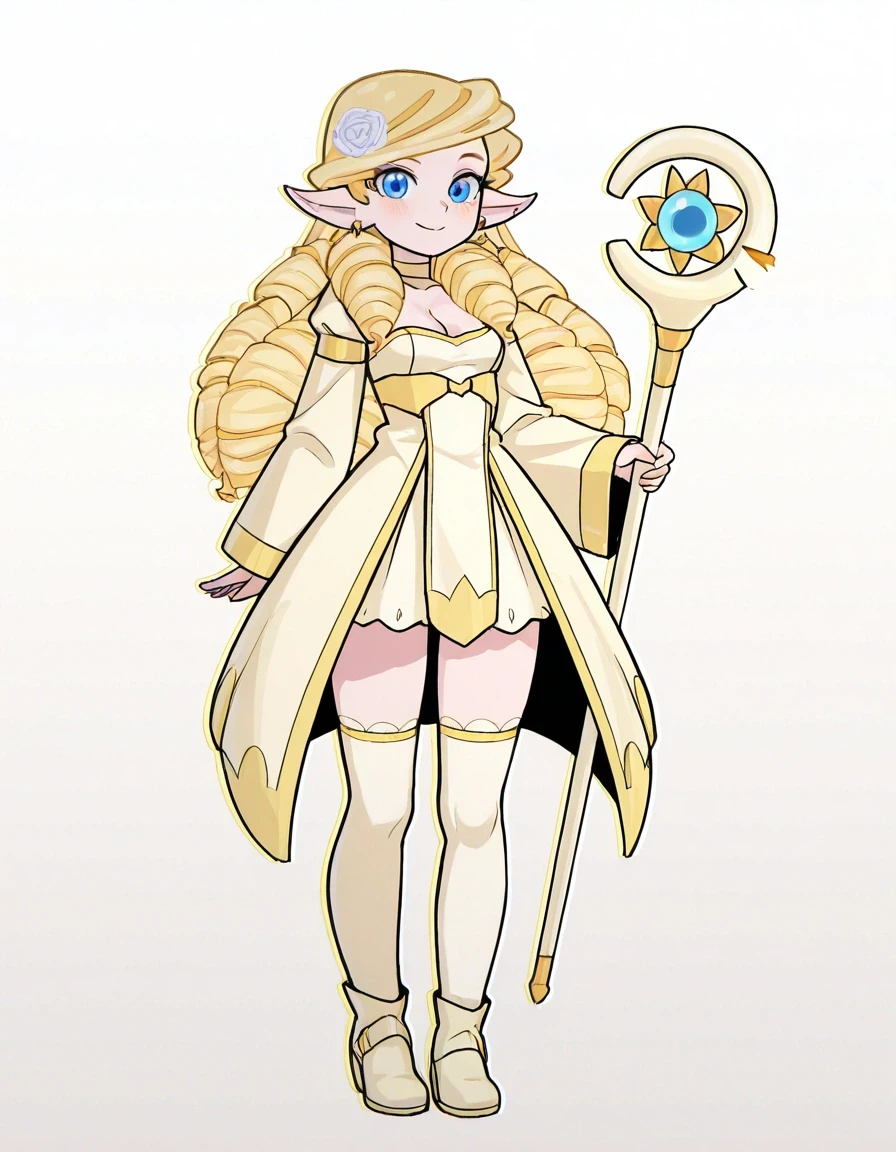 Celeste, blond hair, blue eyes, long hair, pointy ears, elf, flower head ornament, earrings