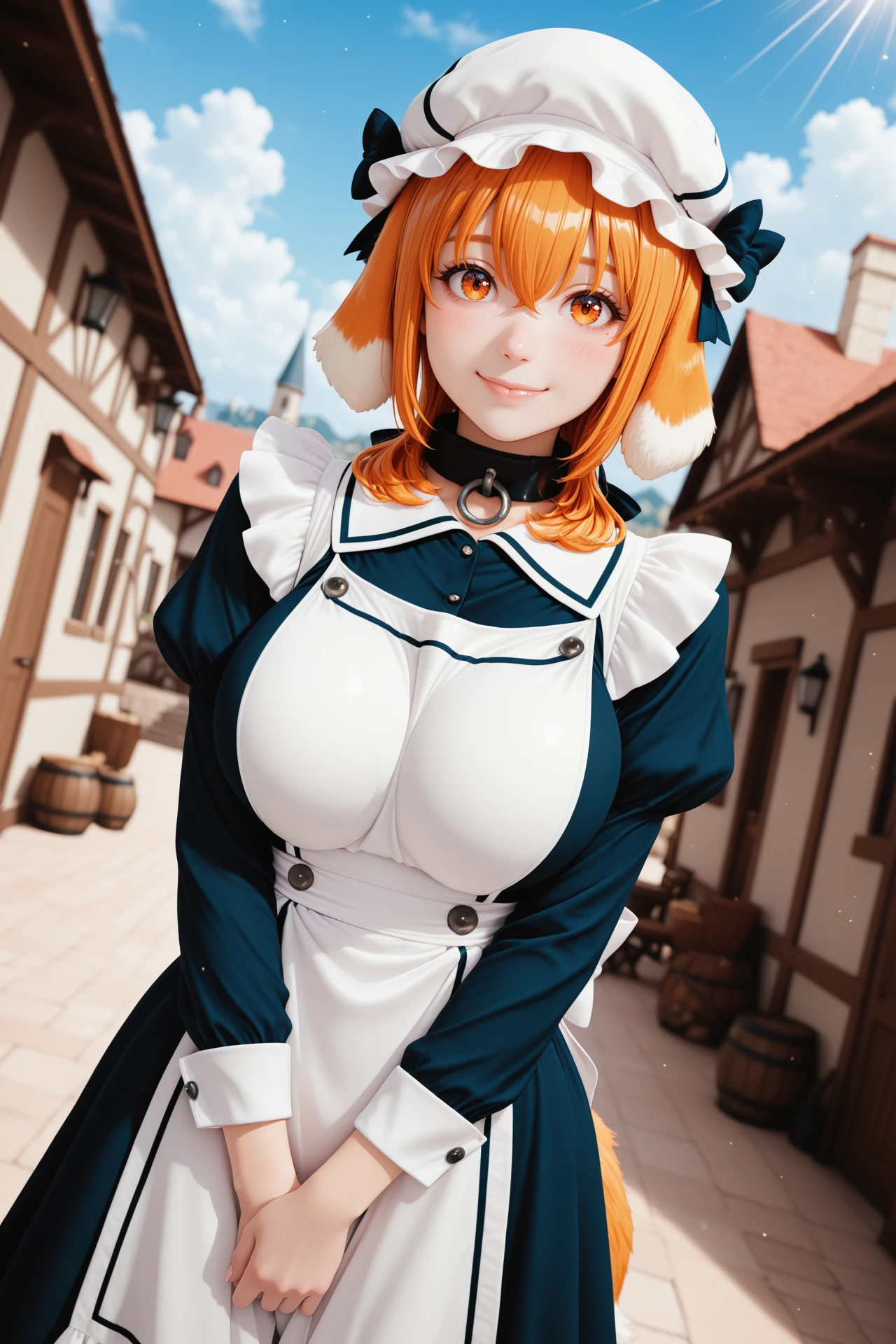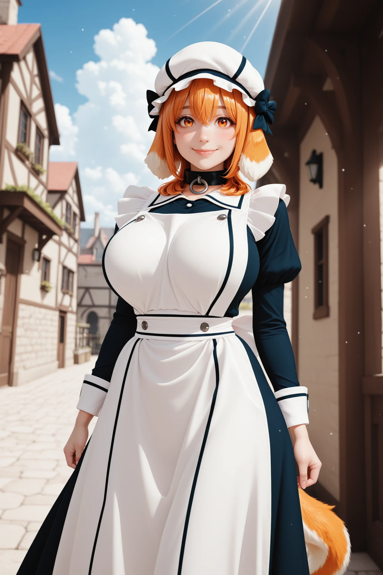 Main Prompt: dog girl, animal ears, dog ears, floppy ears, orange hair, medium hair, hair bow, hair between eyes, bangs, amber eyes, dog tail, large breasts,