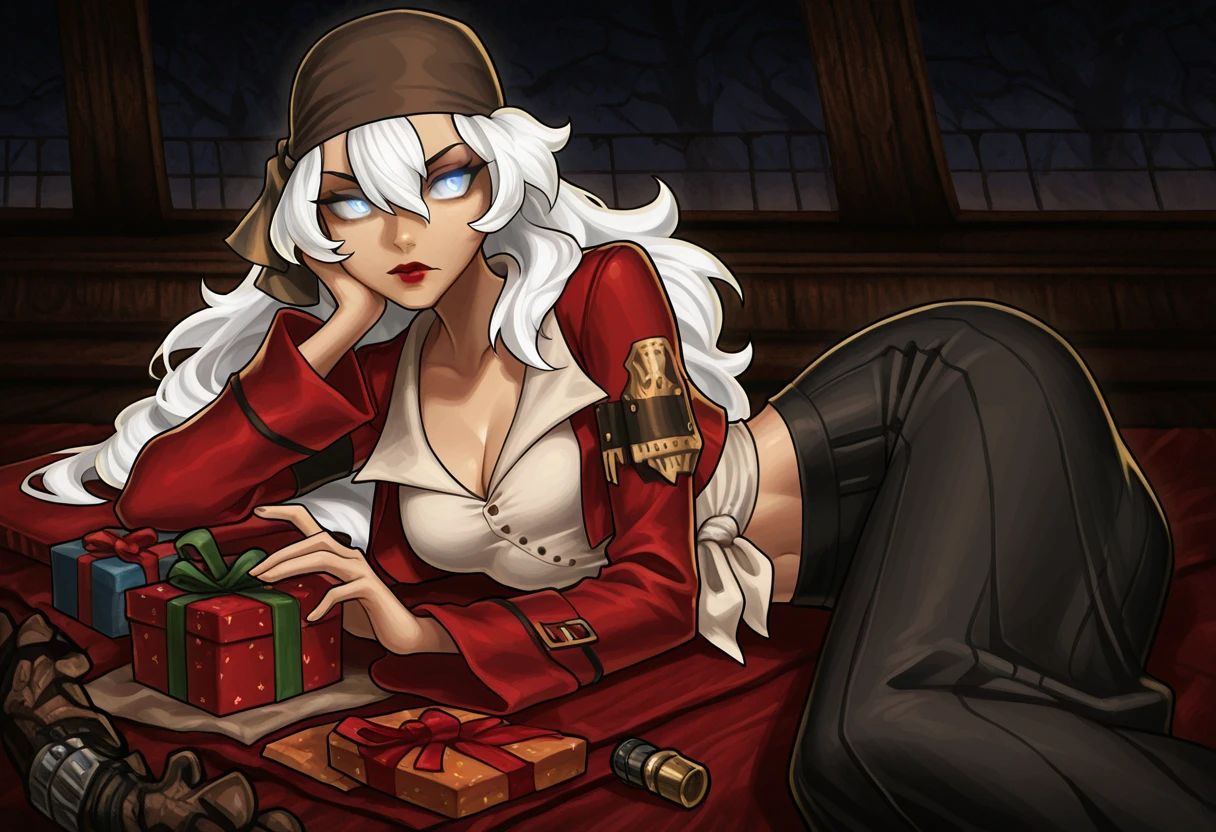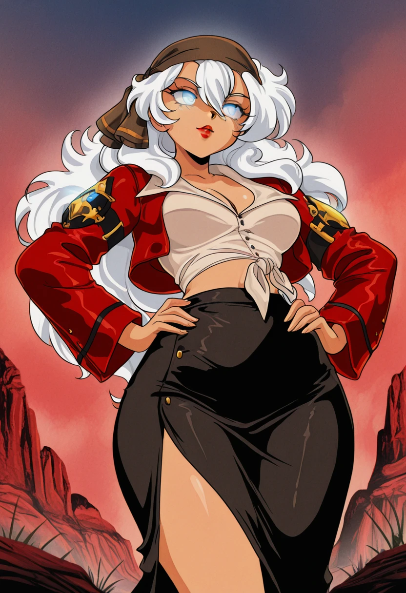 bandana, white shirt, collared shirt, buttons, cropped jacket, red jacket, long sleeves, tied shirt, midriff, long skirt, black skirt,