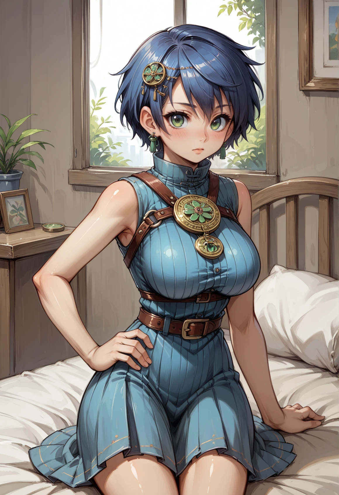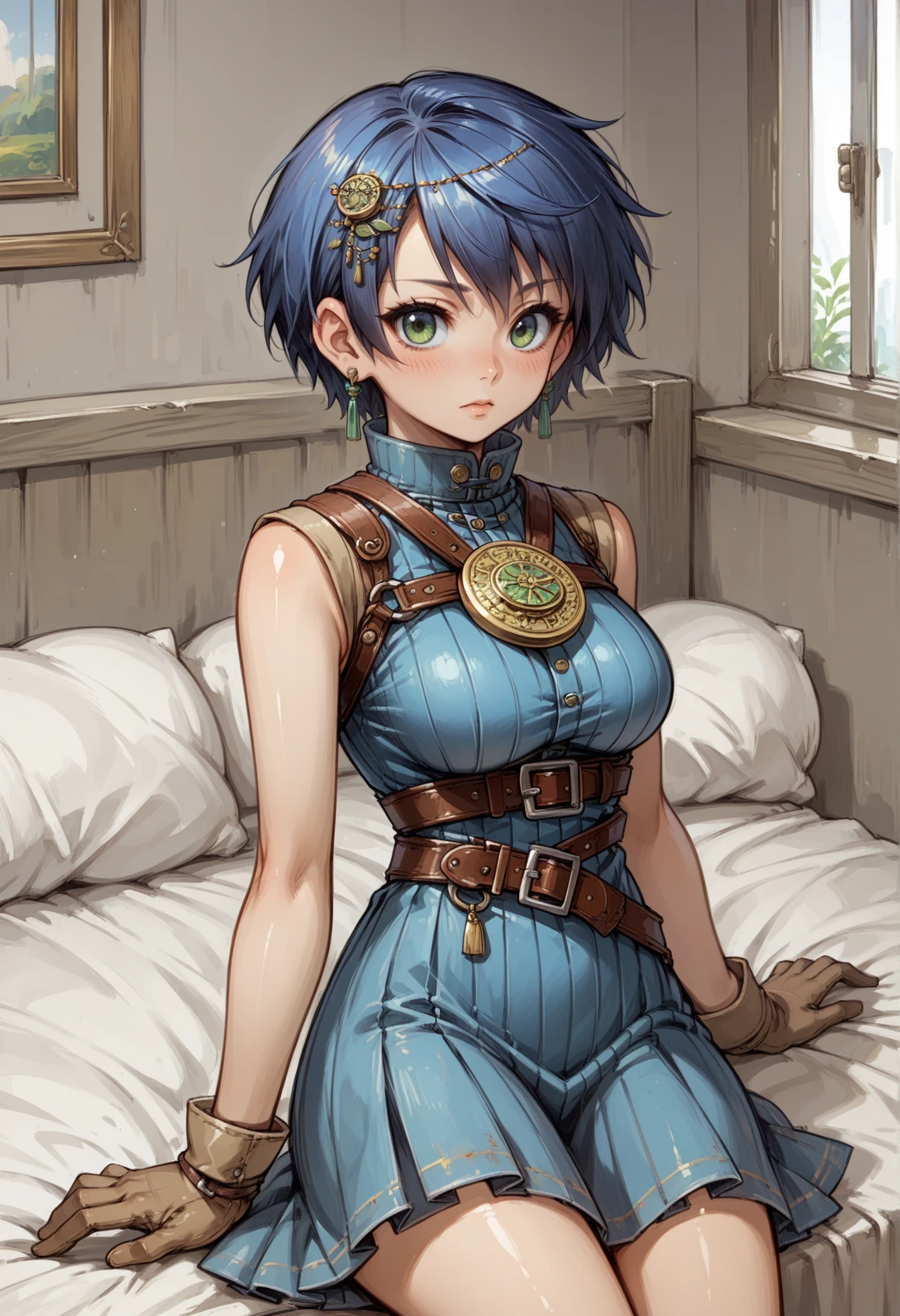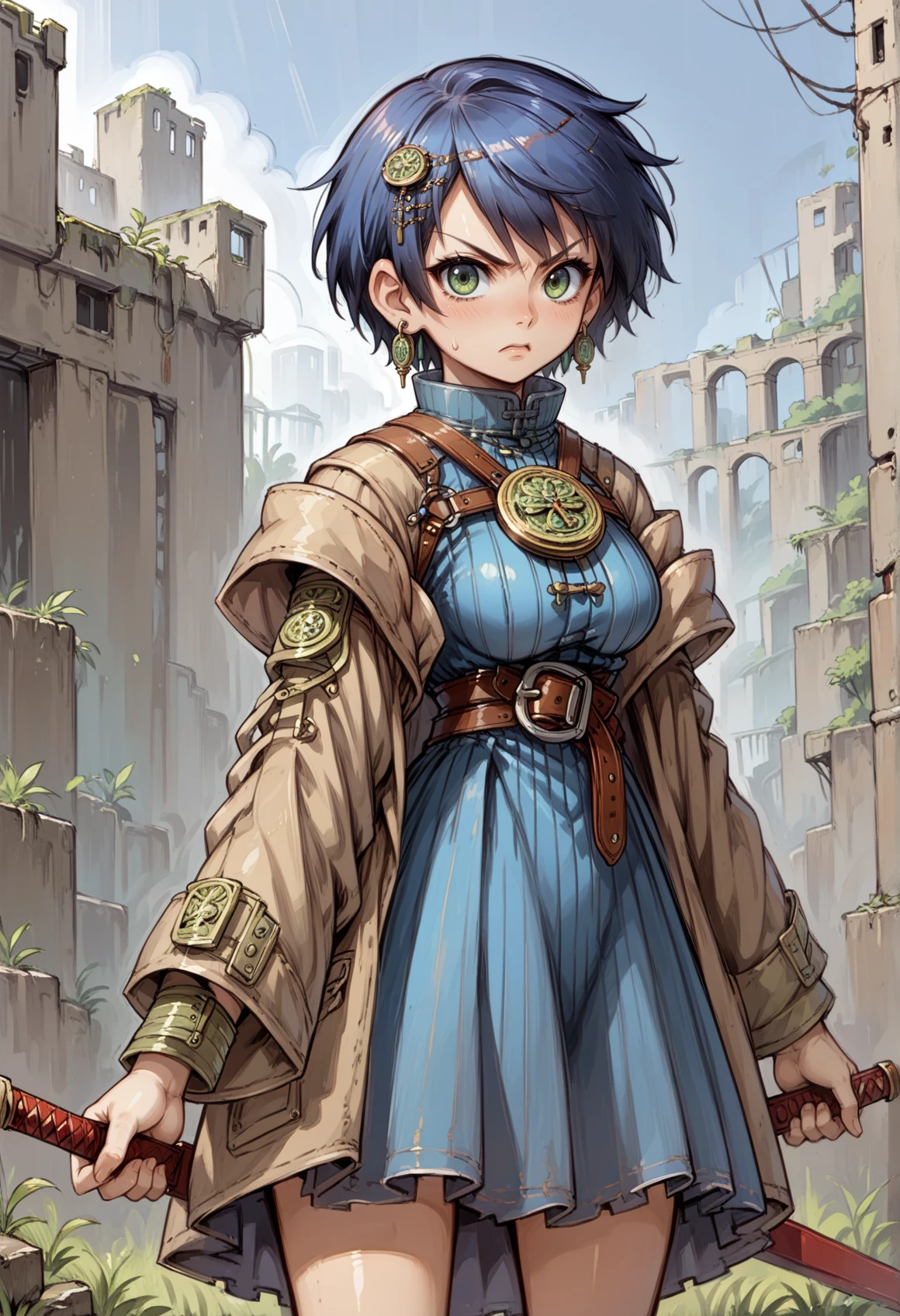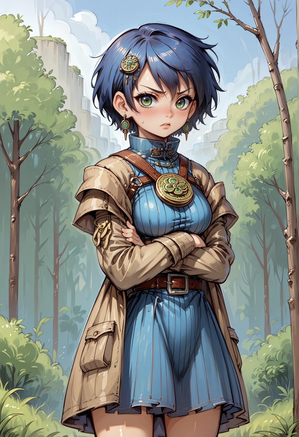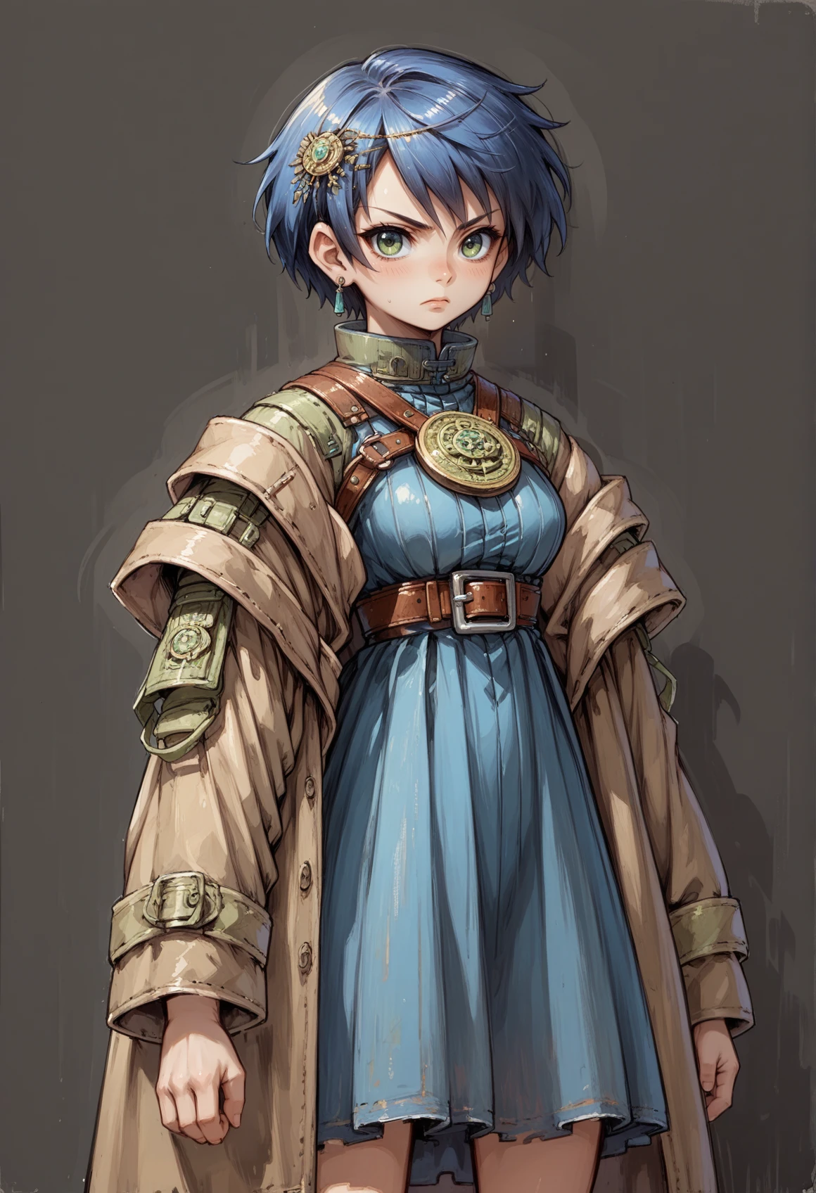 short hair, blue hair, hair ornament, earrings, jewelry, green eyes, high collar, medallion, harness, belt, blue dress, brown coat, skirt,