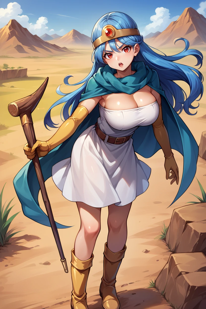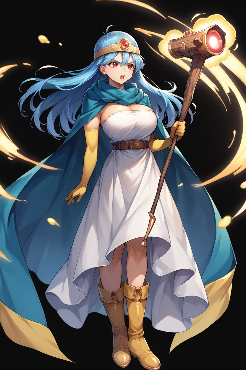 circlet, blue cape, white dress, strapless, belt, elbow gloves, yellow gloves, yellow boots