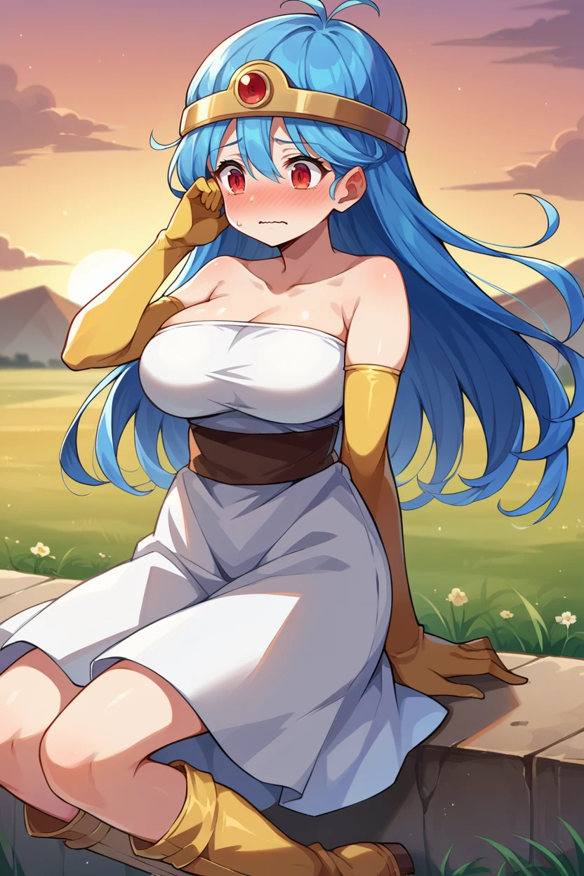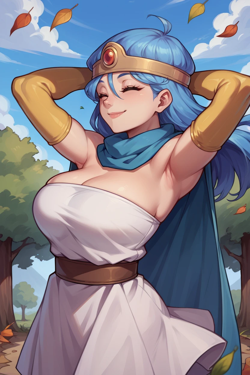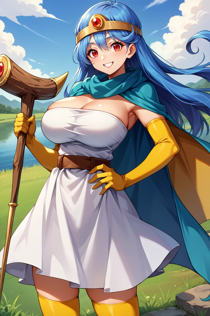 Add "circlet, blue cape, white dress, strapless, belt, elbow gloves, yellow gloves, yellow boots" for her typical look.