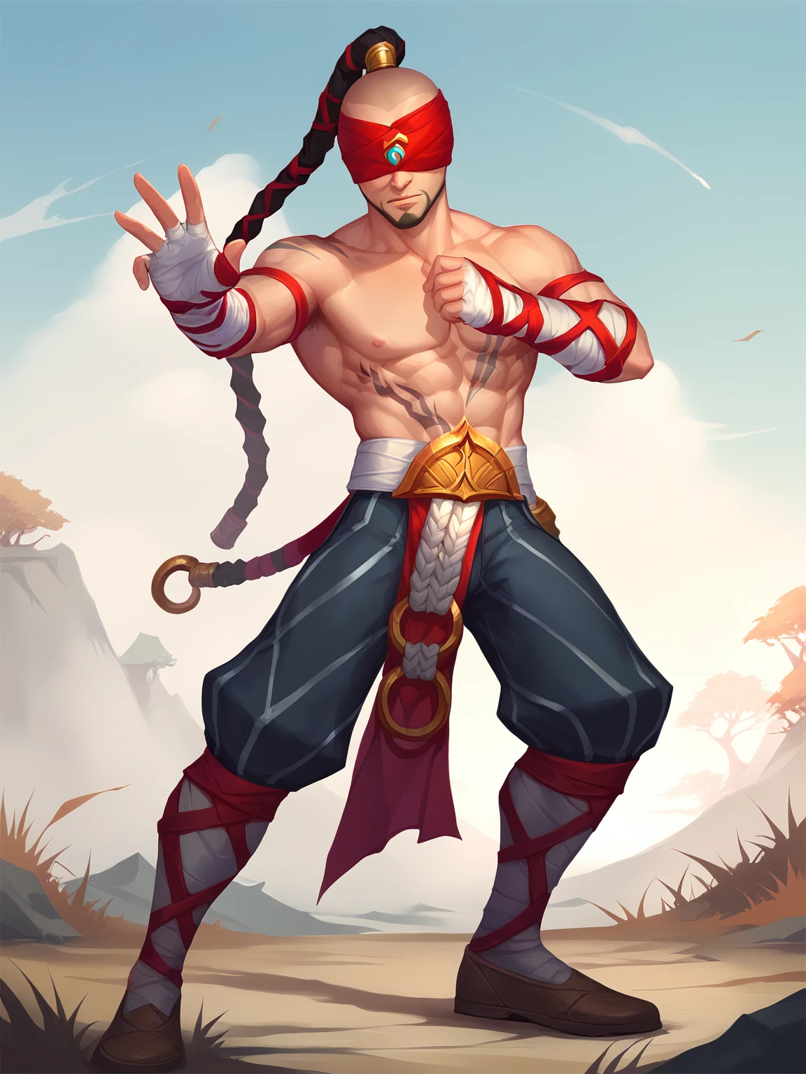 LeeSin, 1man, solo, shaved head, long black braid hairstyle, red blindfold with decoration, bristle, chest tattoo, abs, naked torso, white and red bandages on the arms, black pants with decoration, white and red bandages under pants, shoes