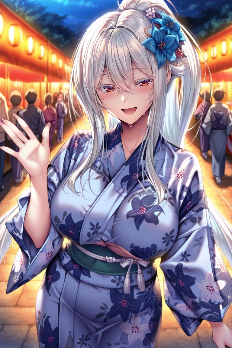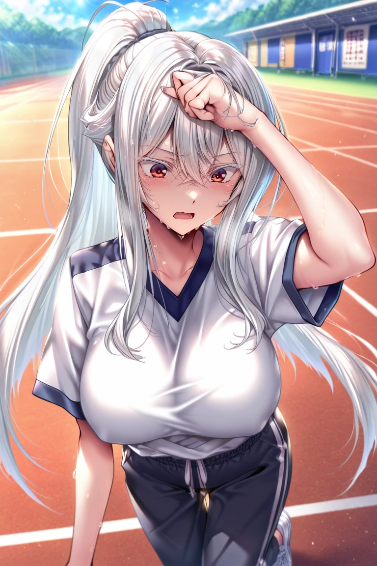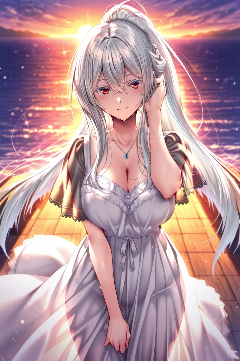 white hair, very long hair, ponytail, bangs, hair between eyes, side locks, red eyes, large breasts,