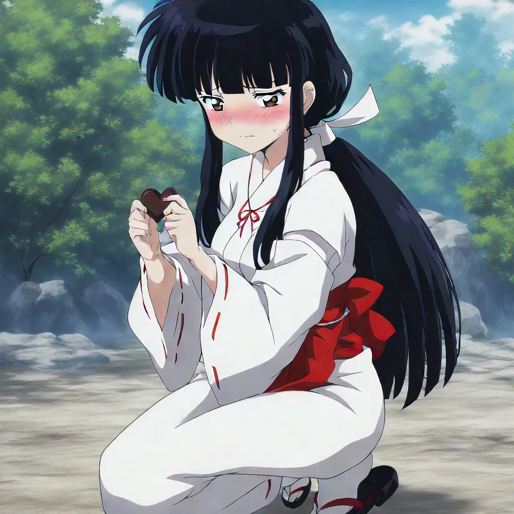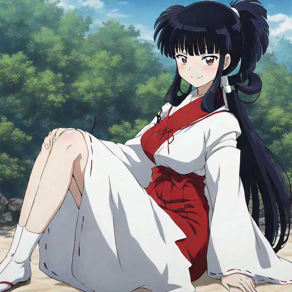 kikyo\ (iy\), black hair, long hair, bangs, sidelocks, ponytail, brown eyes, white and red kimono, sash, japanese clothes, socks, sandals, large breasts, 1girl, solo