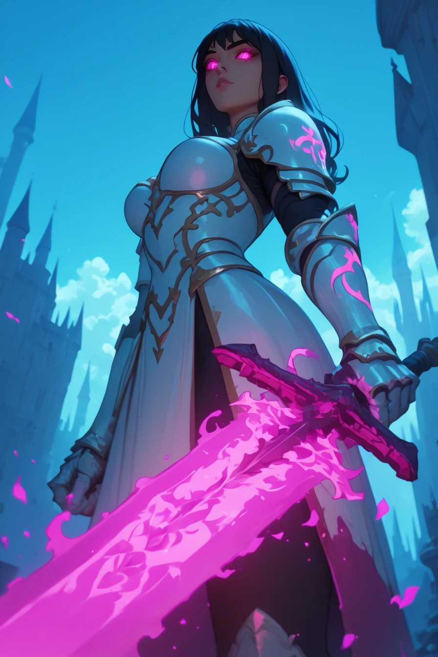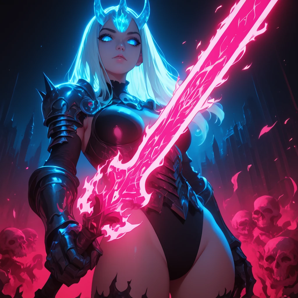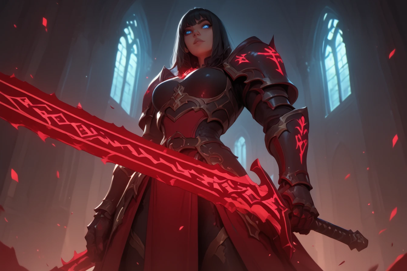 Prompt:"score_9, score_8_up, score_7_up, score_6_up, score_5_up, score_4_up, (beautiful demon woman, horns, wearing armor, holding pink glowing sword:1.2), dungeon in background, concept art, digital art, realistic, hkstyle"