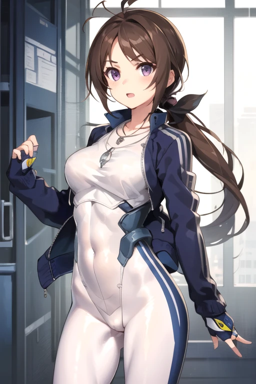 MakikoOriotorai, 1girl, solo, long hair, low ponytail, brown hair, fingerless gloves, brown eyes, jewelry, purple eyes, dark blue jacket, ponytail, necklace, white bodysuit, dark blue bodysuit, cropped jacket