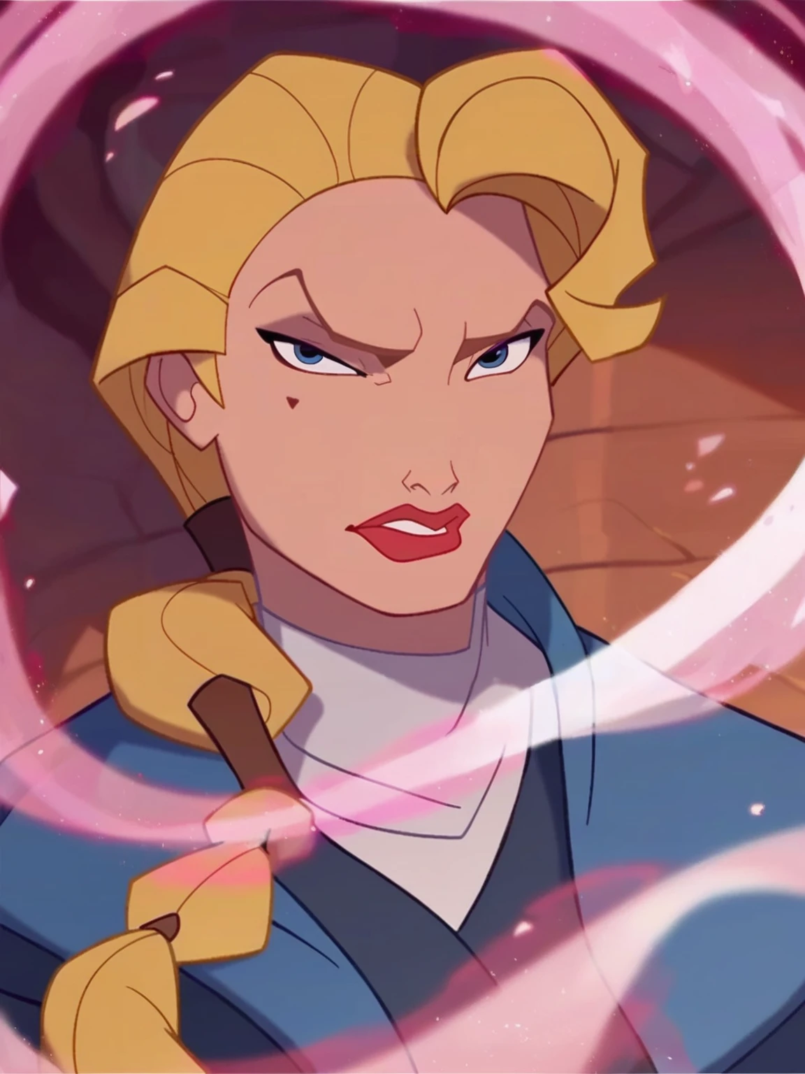 h_s, 1girl, blond hair, blue eyes, red lips, long ponytail hair, mole under eye