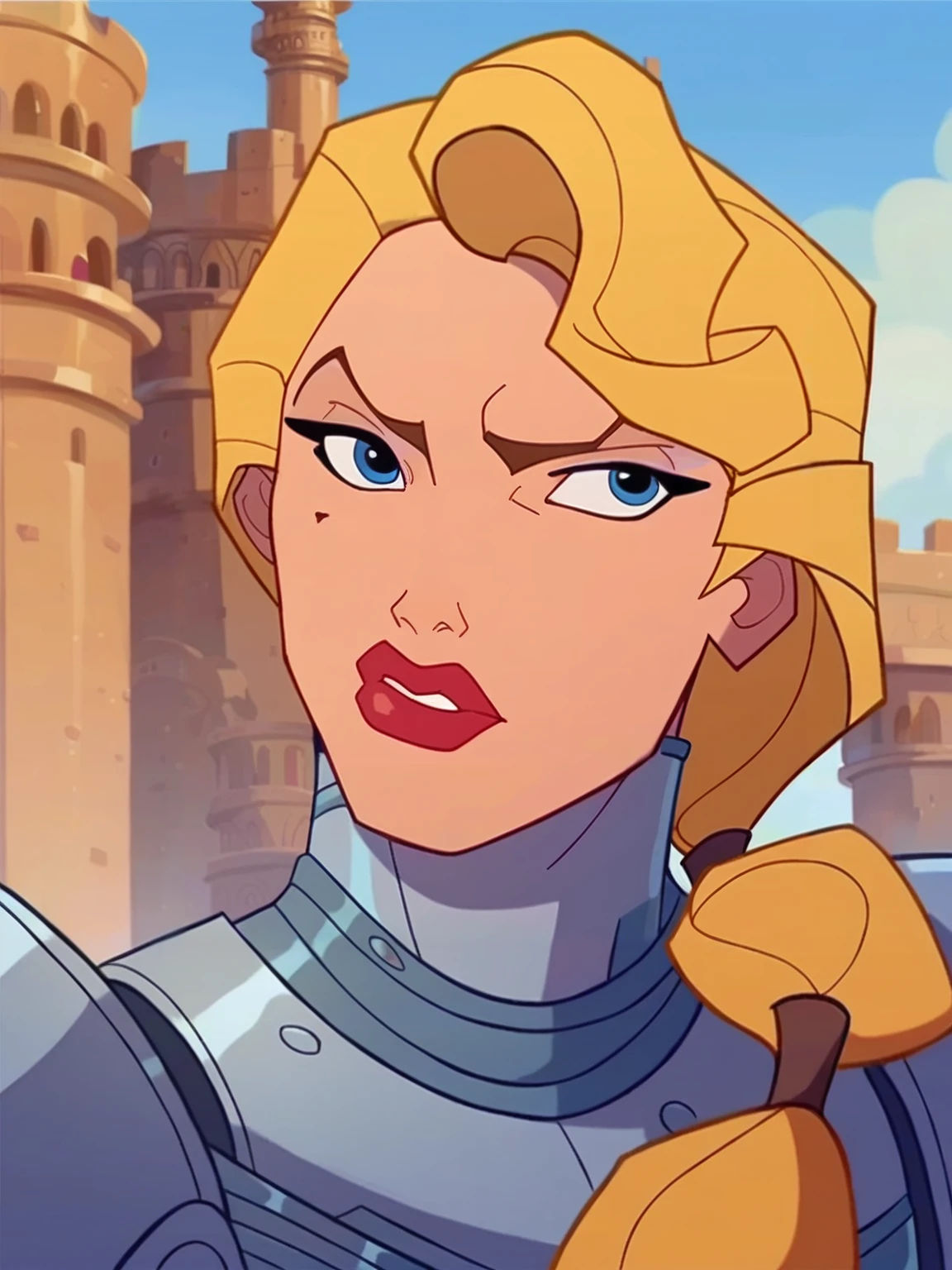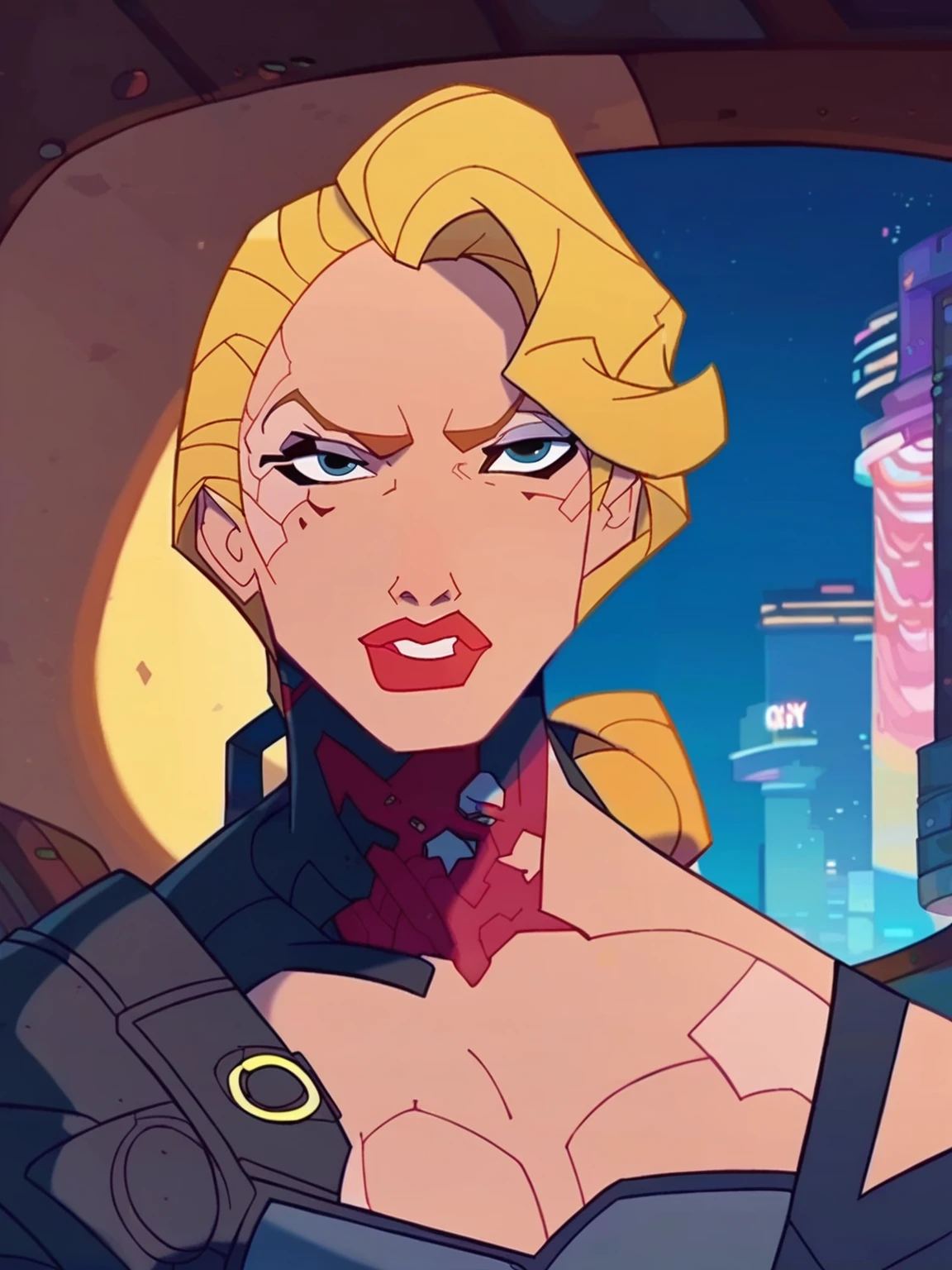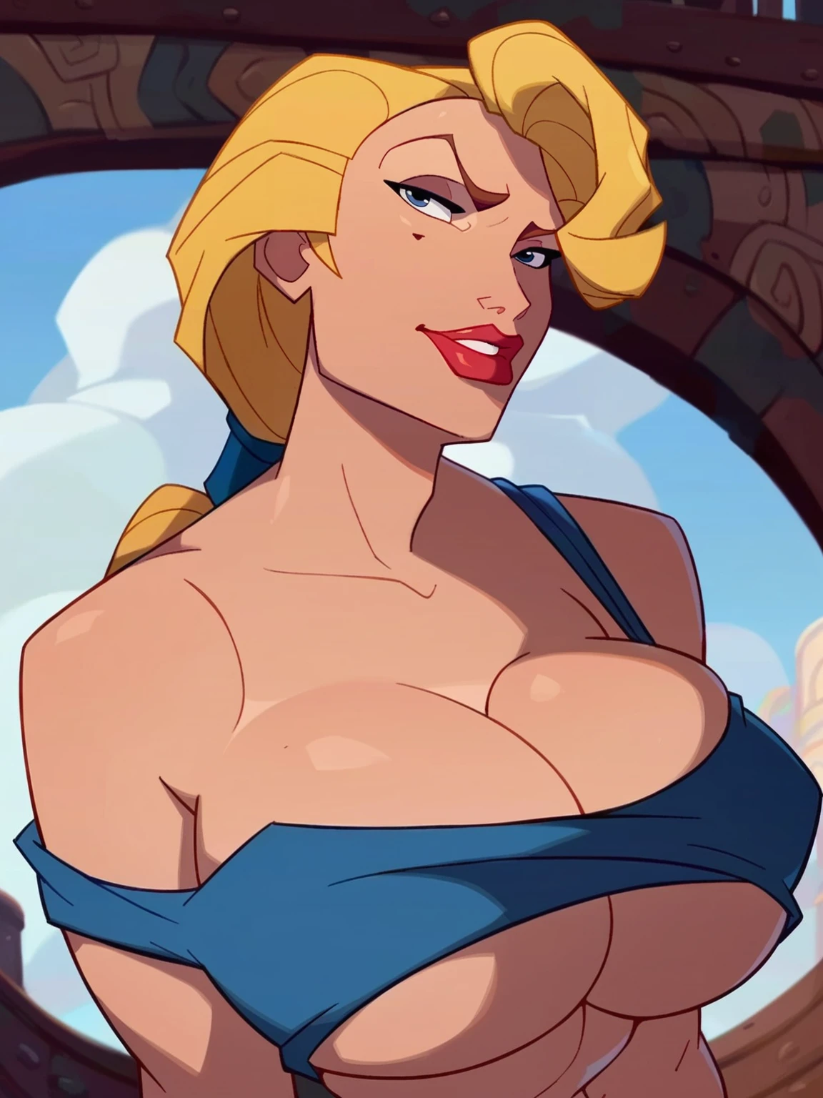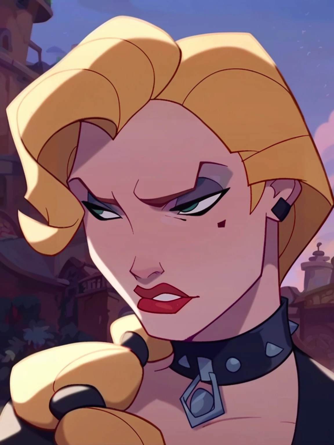 Recommend prompt: "h_s, 1girl, blond hair, blue eyes, red lips, long ponytail hair, mole under eye"