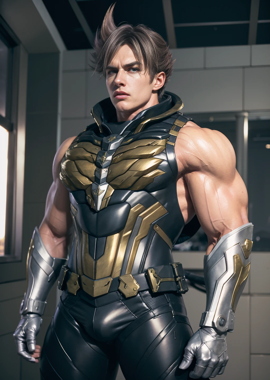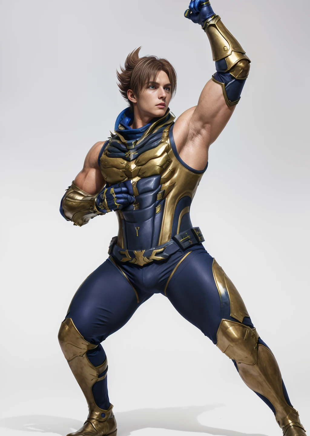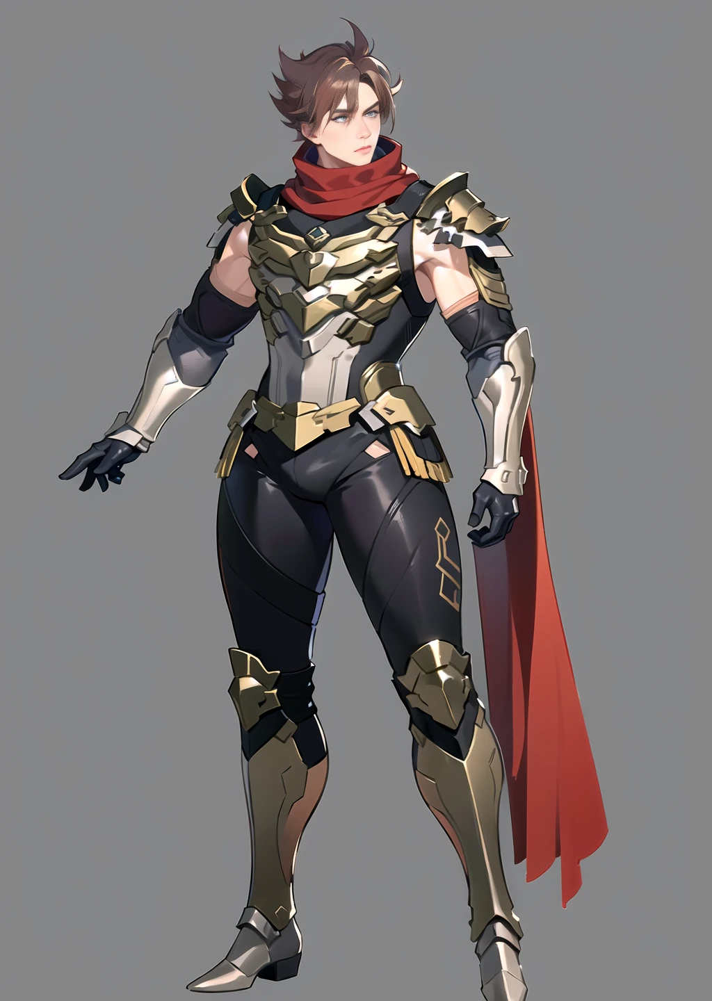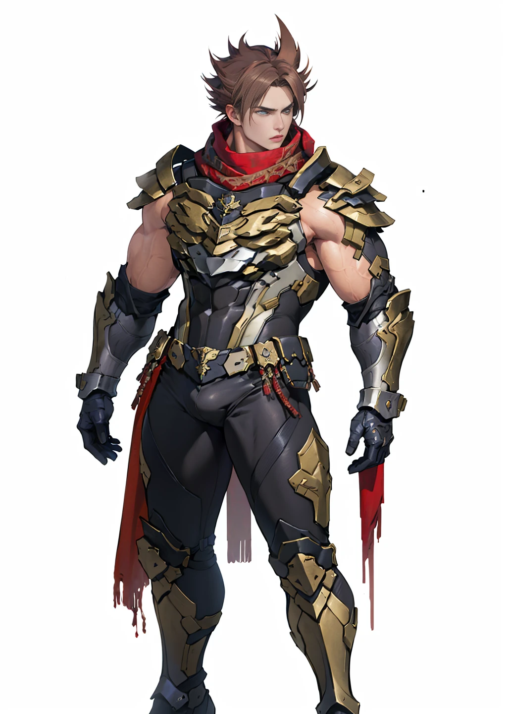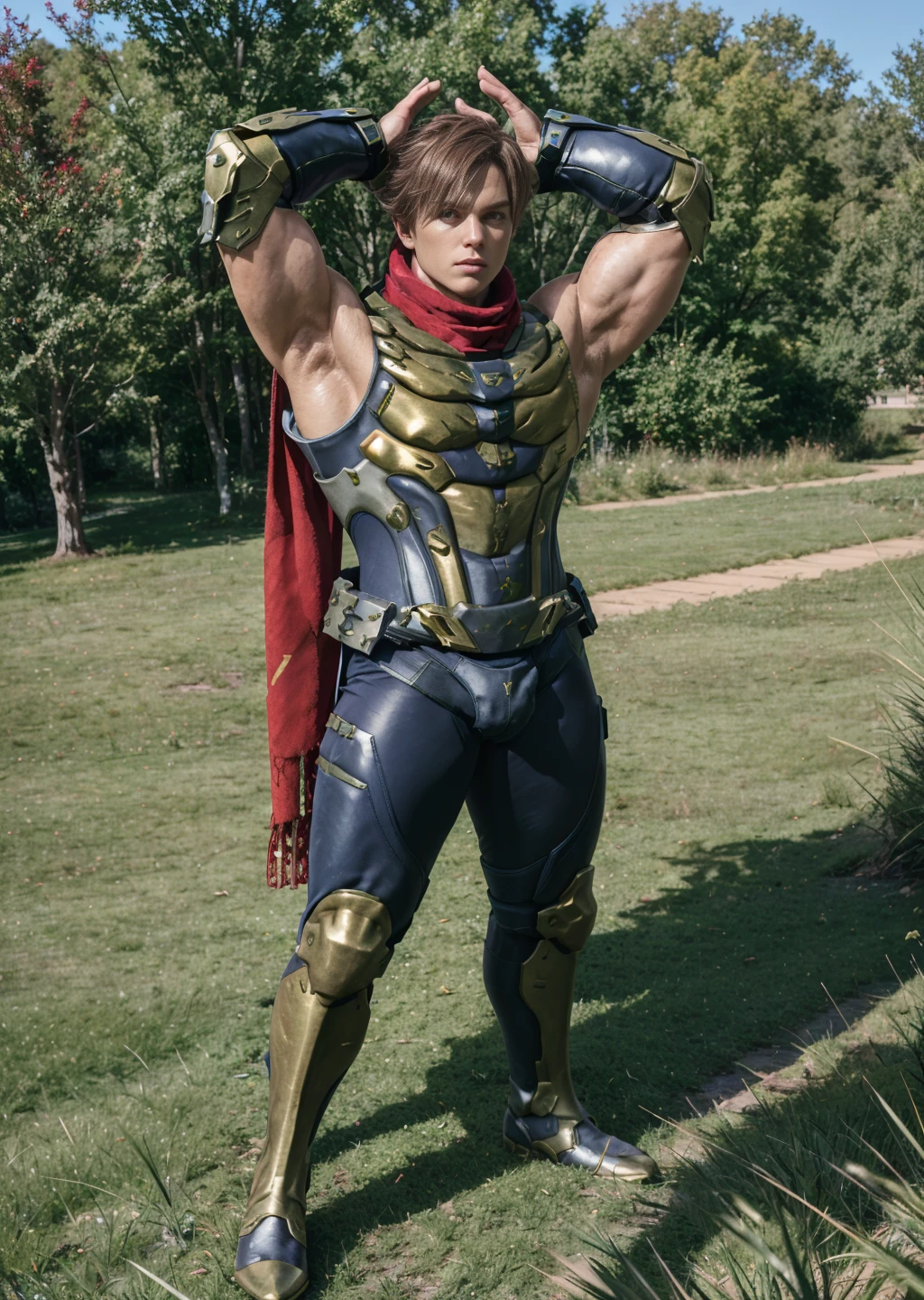 Lars Alexandersson, Swedish, European, brown hair, blue eyes, spiked hair, armor, bulge, muscles, biceps, 1guy, armor boots, torso armor, sleeveless, gauntlets, defeated, shoulder pad, scarf,