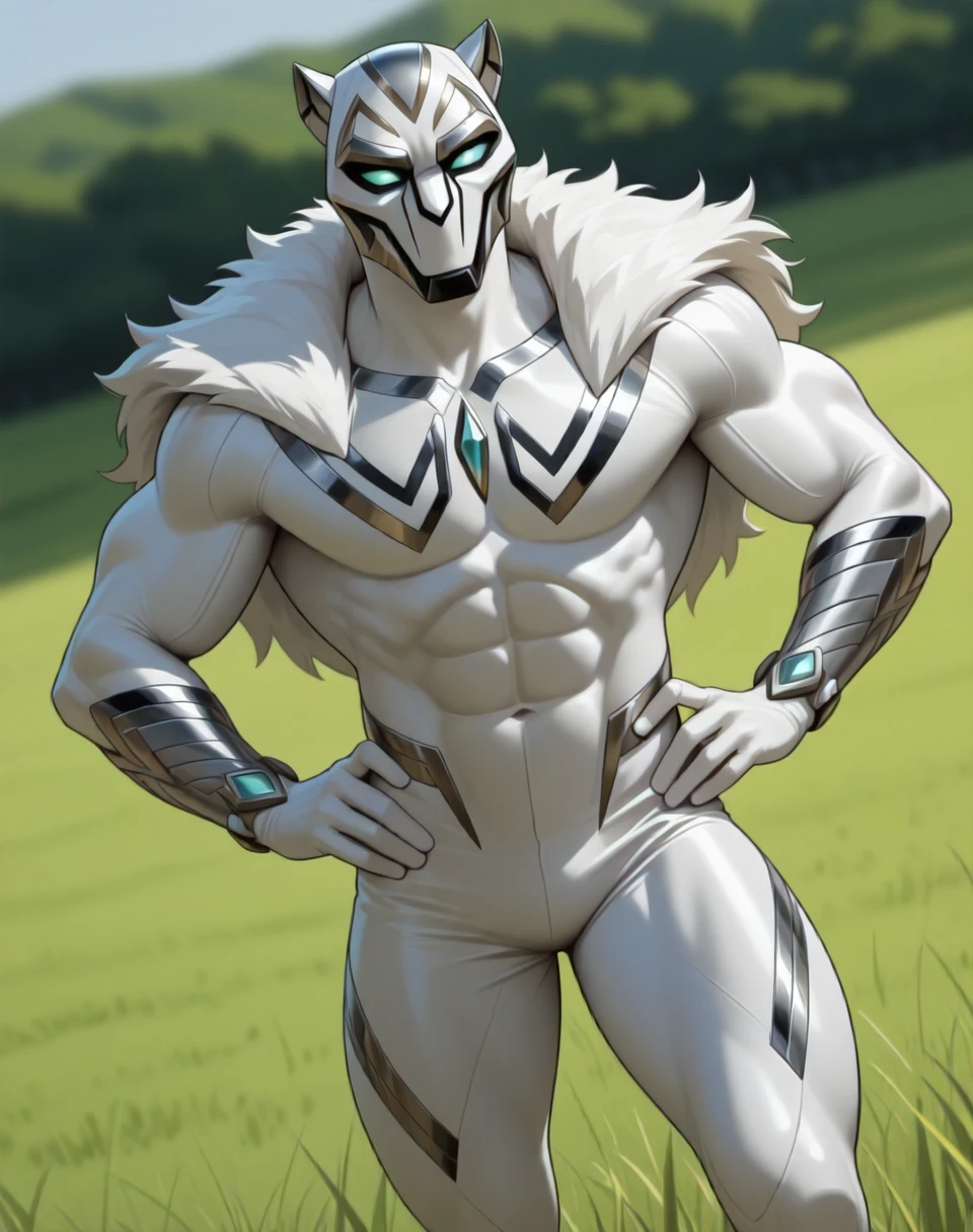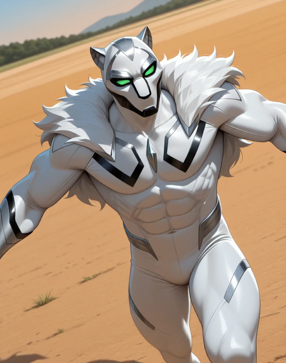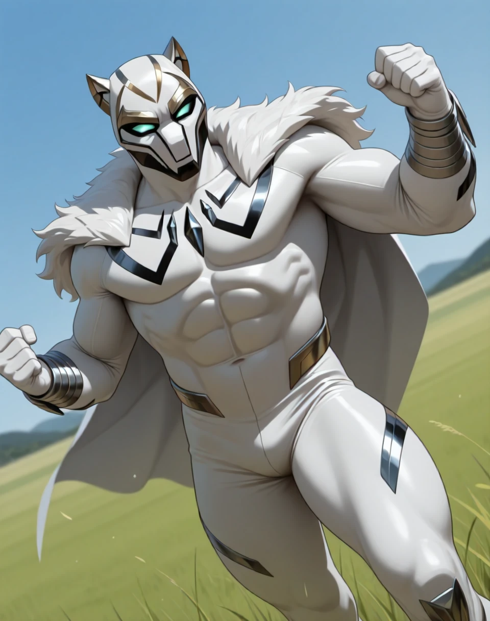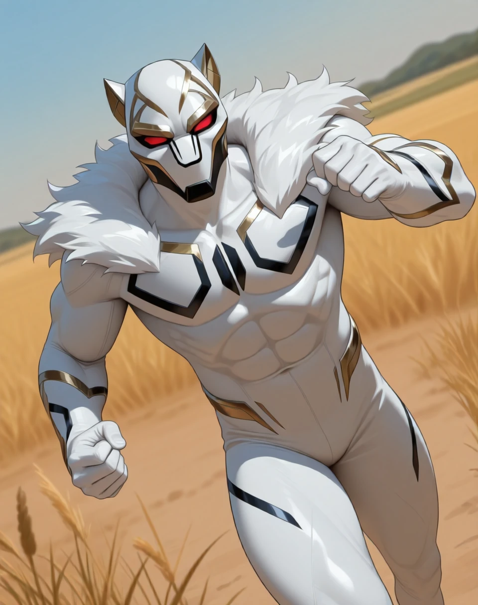 Adding additional prompts like ( wolf themed supersuit, wolf helmet, spandex supersuit, faux fur neckline, Wakandan style white supersuit, solid color eyes, ) can help the image of the character be made better.