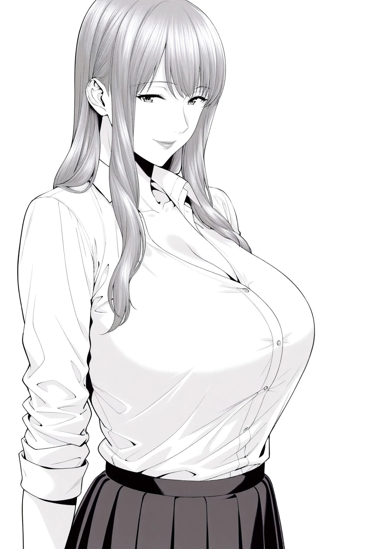 tomoko, greyscale, monochrome, long hair, huge breasts, hair1, sidelocks,