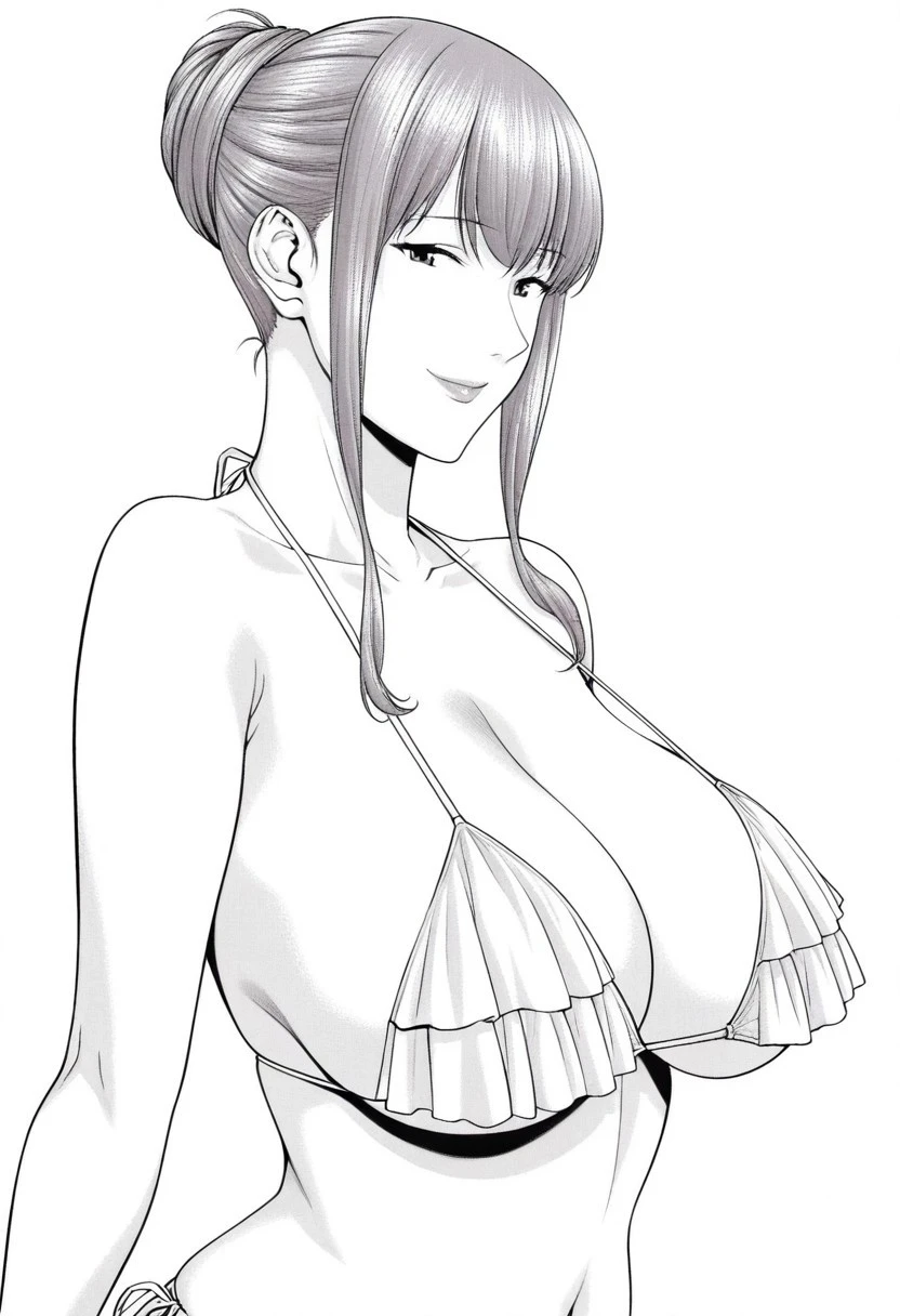 tomoko, greyscale, monochrome, updo, huge breasts, sidelocks,