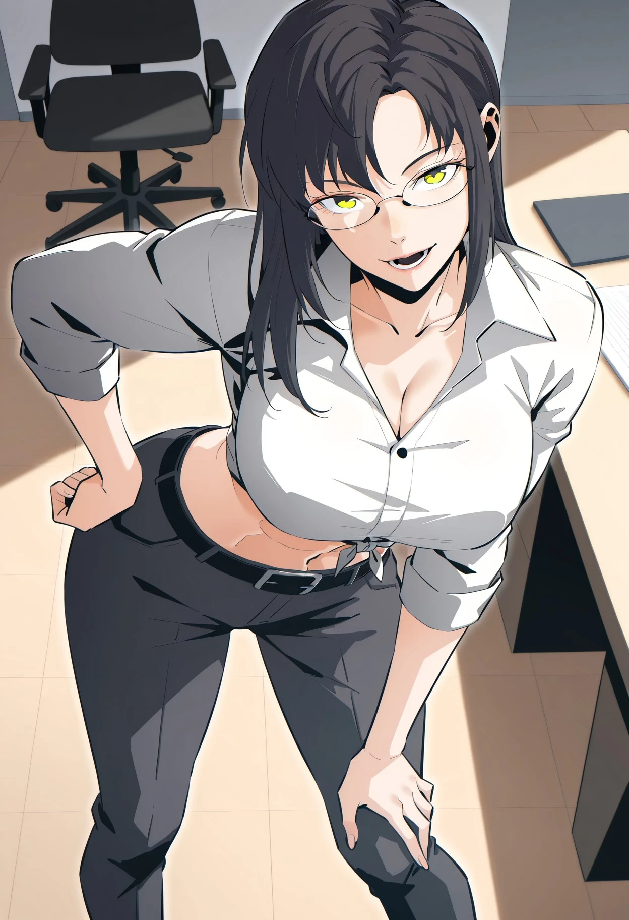 1girl, solo, hling, mature female, delicate thin face, tapered jawline, dimples, dark grey hair, side parted bangs, sidelocks, chest-length hair, yellow eyes, sharp eyes, thin eyebrows, glasses, thin black glasses frames, light pink lips, thin athletic build, hourglass figure,broad shoulders, large breasts, narrow waist, abs, wide hips, long legs,