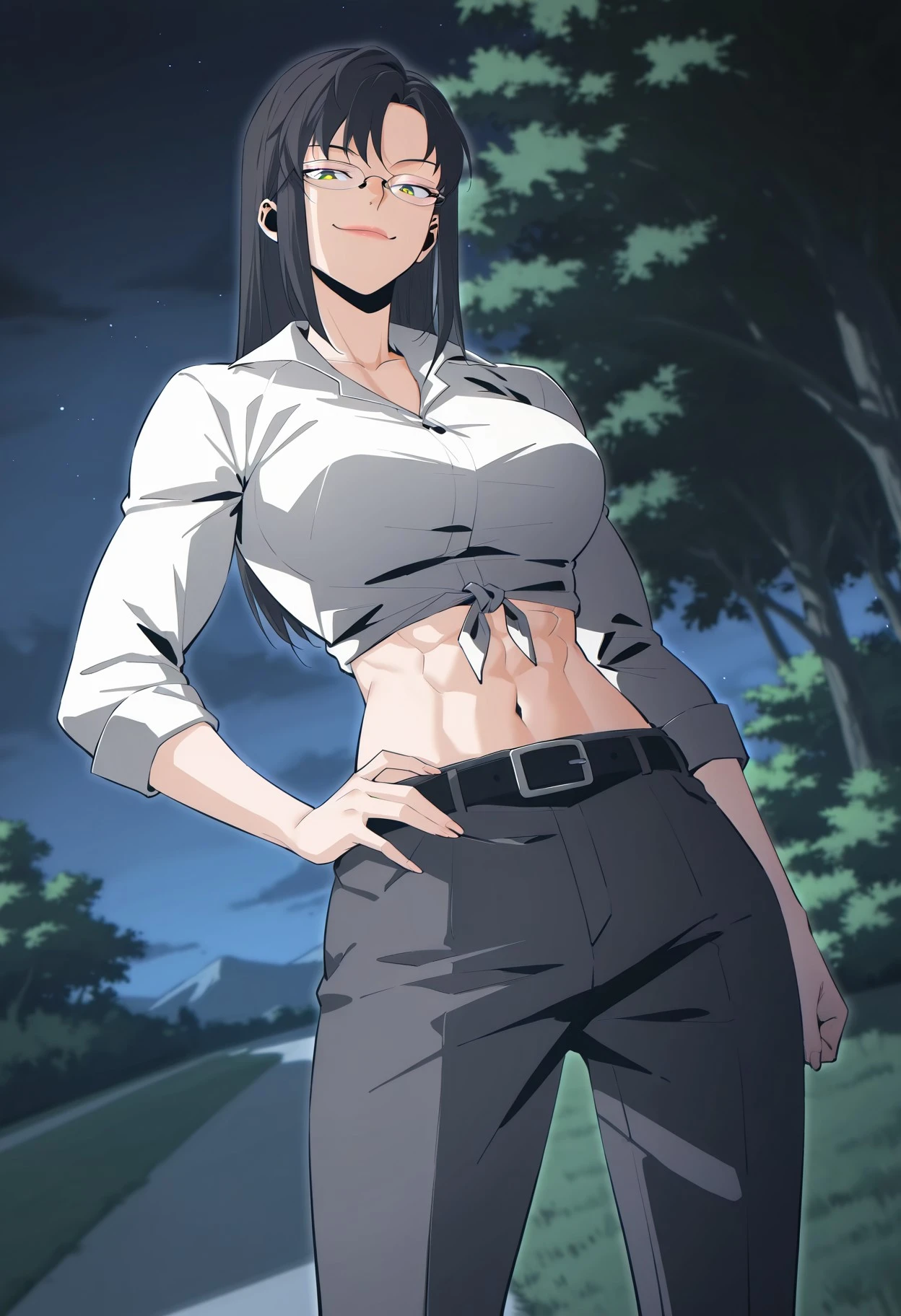 Default_outfit, white camp collars shirt, fitted shirt, rolled up sleeves, tied shirt hem, midriff, black belt, tight dark grey trousers, black high heelsDescription