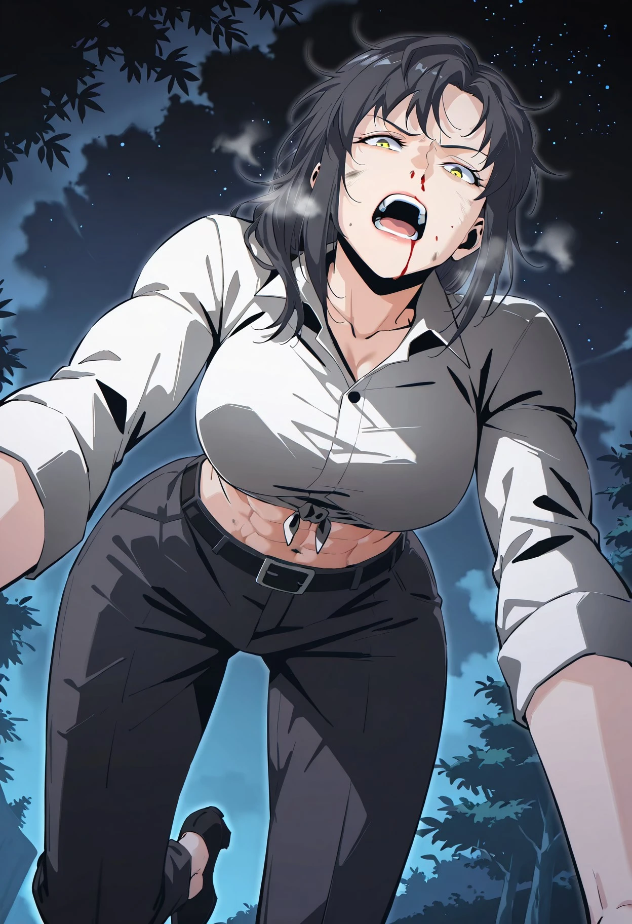 Default_outfit, white camp collars shirt, fitted shirt, rolled up sleeves, tied shirt hem, midriff, black belt, tight dark grey trousers, black high heeled boots, short boots,