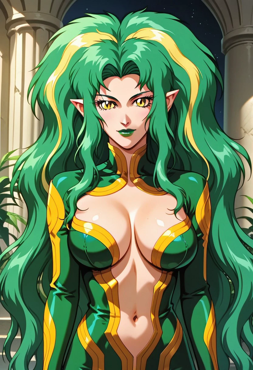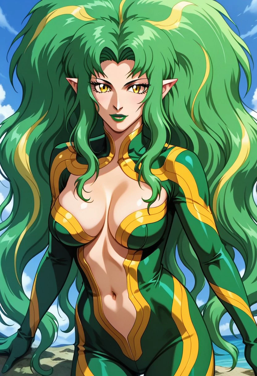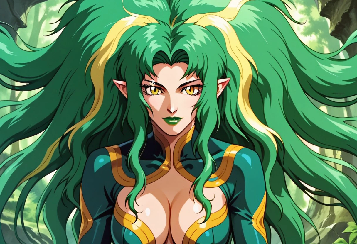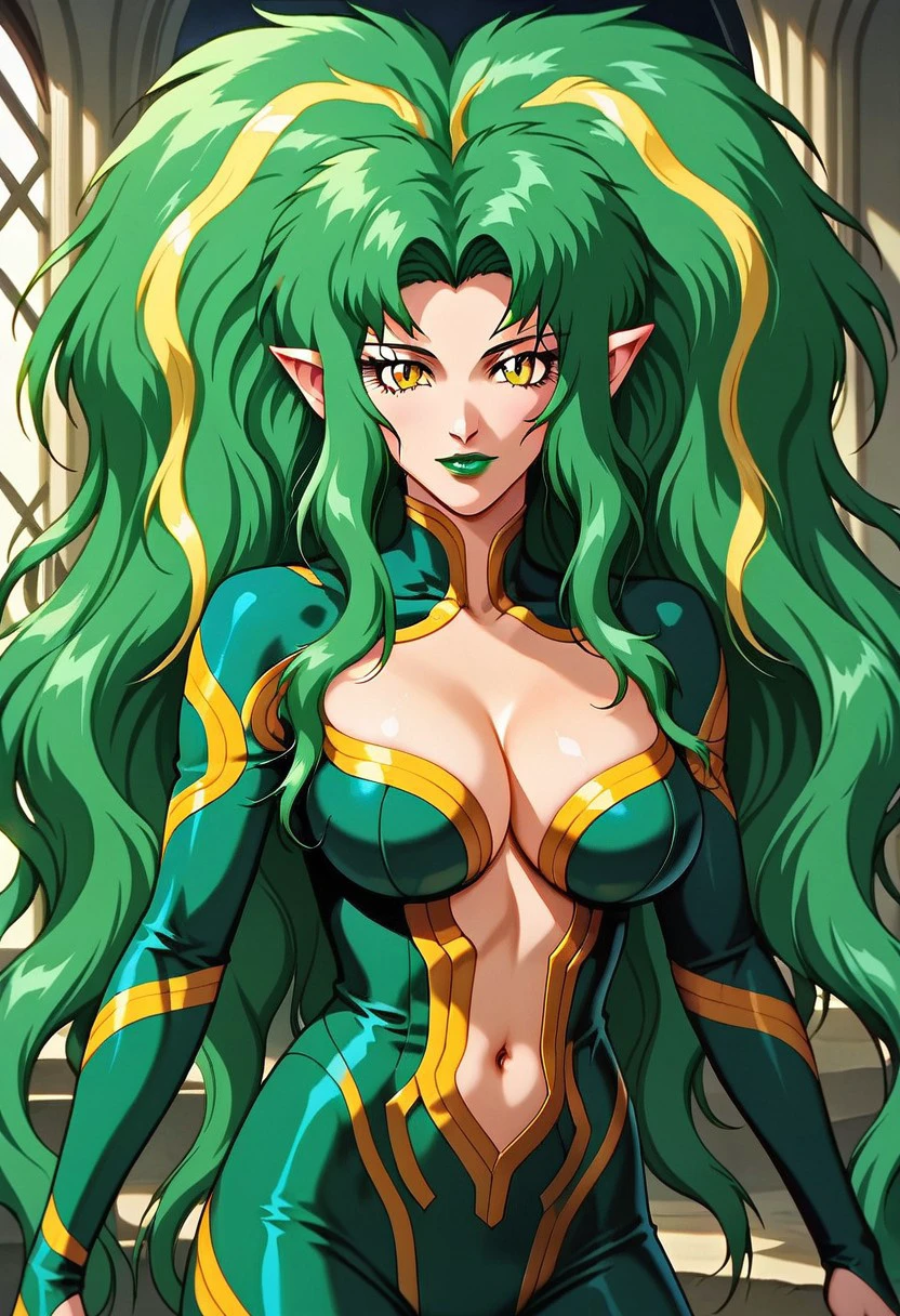 caroline, monster girl, large breasts, green lips, pointy ears, wavy hair, big hair, yellow hair, green hair, parted bangs, slit pupils, yellow eyes, two-tone hair, multicolored hair, long fingernails, (grandiet hair, fangs, transformation)