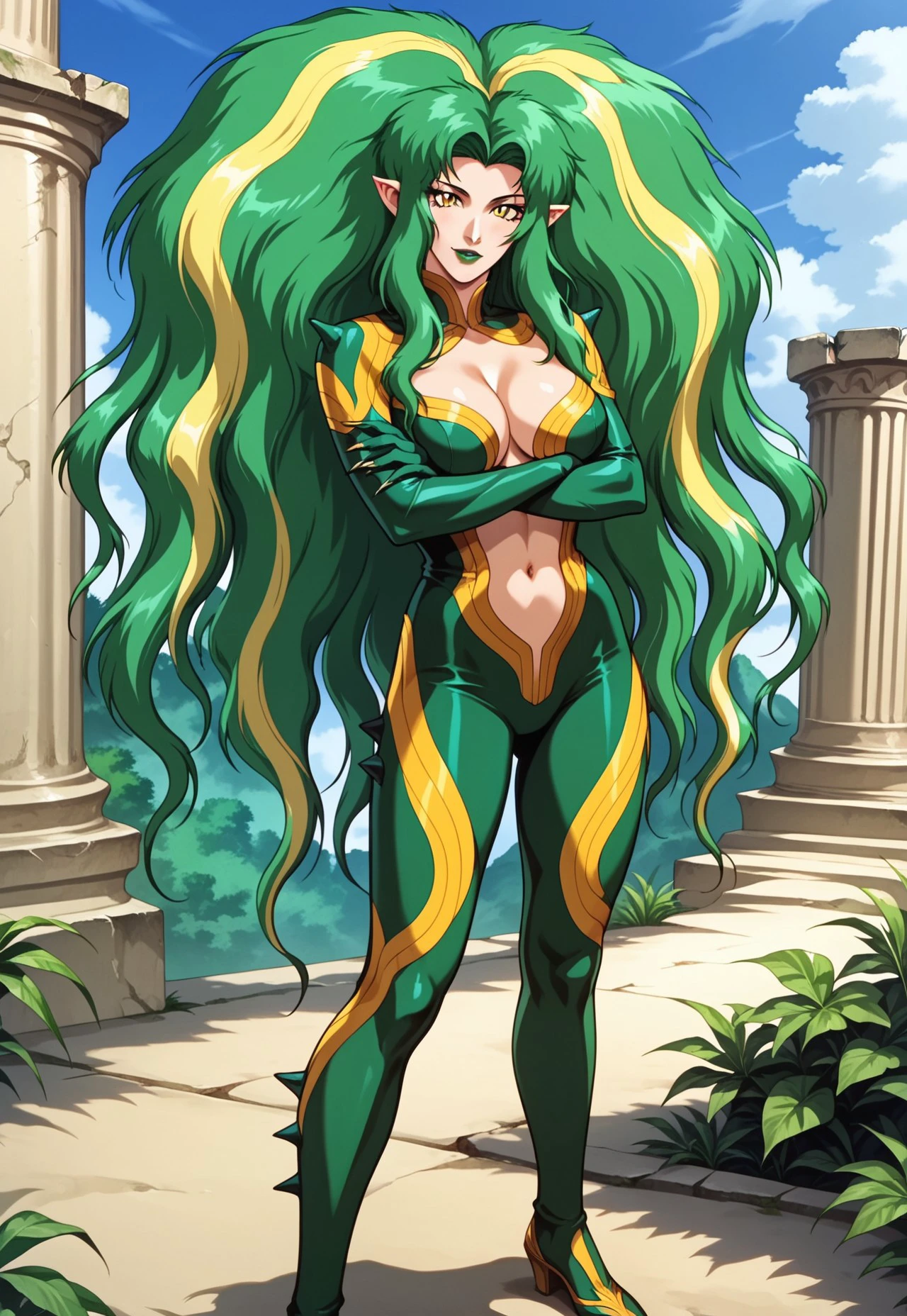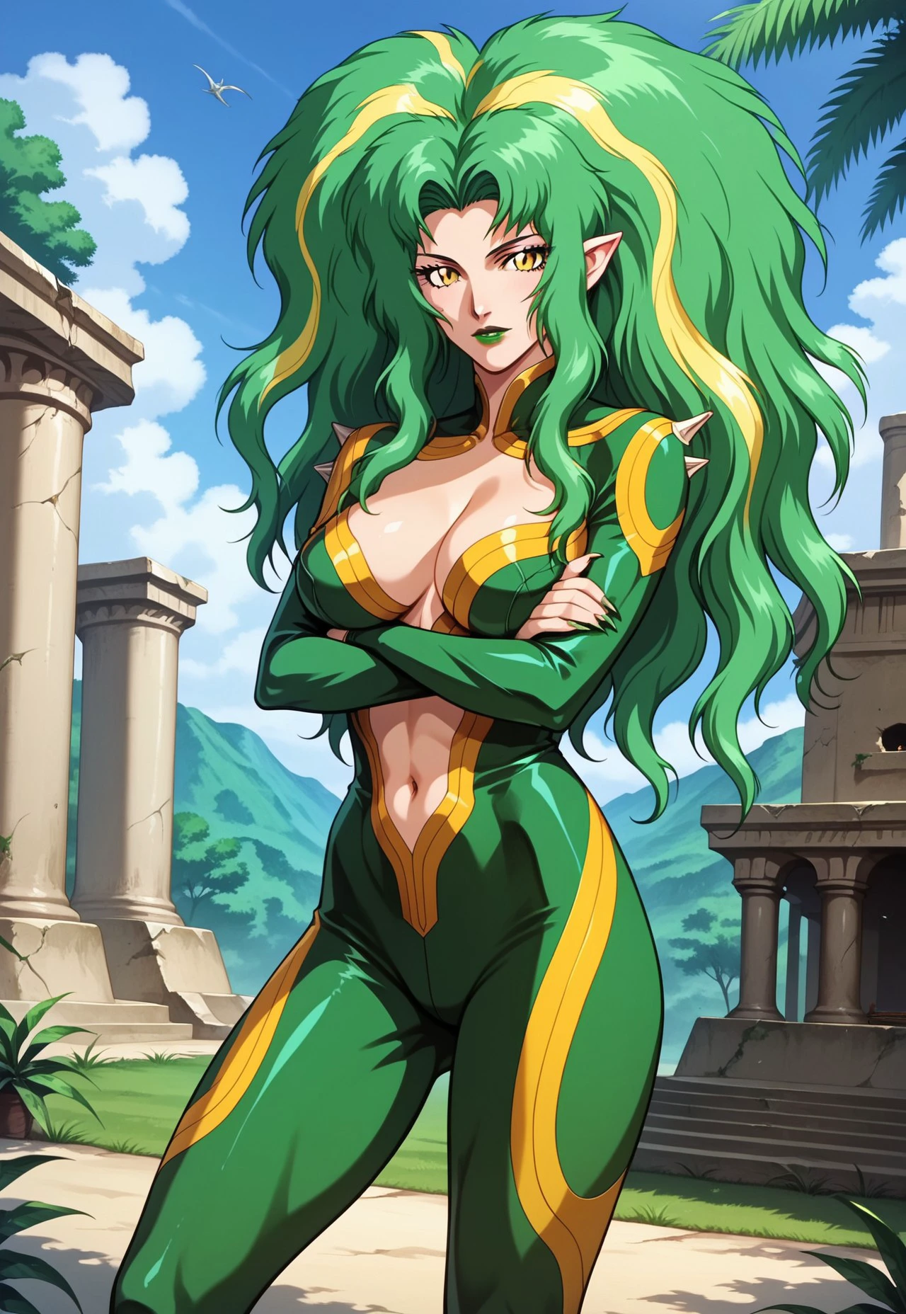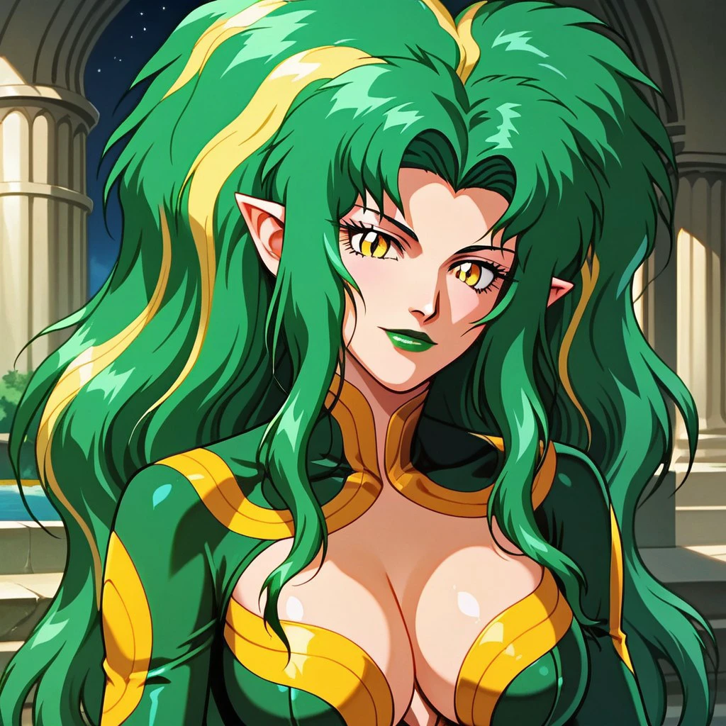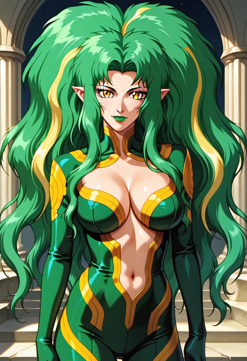 caroline, monster girl, large breasts, green lips, pointy ears, wavy hair, big hair, yellow hair, green hair, parted bangs, slit pupils, yellow eyes, two-tone hair, multicolored hair, long fingernails, (grandiet hair, fangs, transformation)