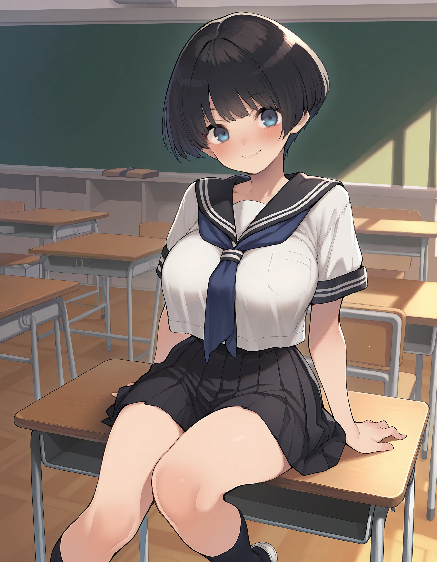 school uniform, serafuku, black sailor collar, short sleeves, blue neckerchief, white shirt, black skirt, pleated skirt, black socks, white loafers,