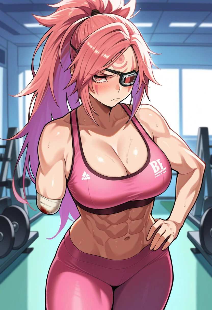 "BKNGGR, pink hair, long hair, ponytail, pink eye, facial tattoo, eyepatch, scar across eye, arm guards, large breasts, cleavage, collared jacket, open kimono, rope belt, amputee"