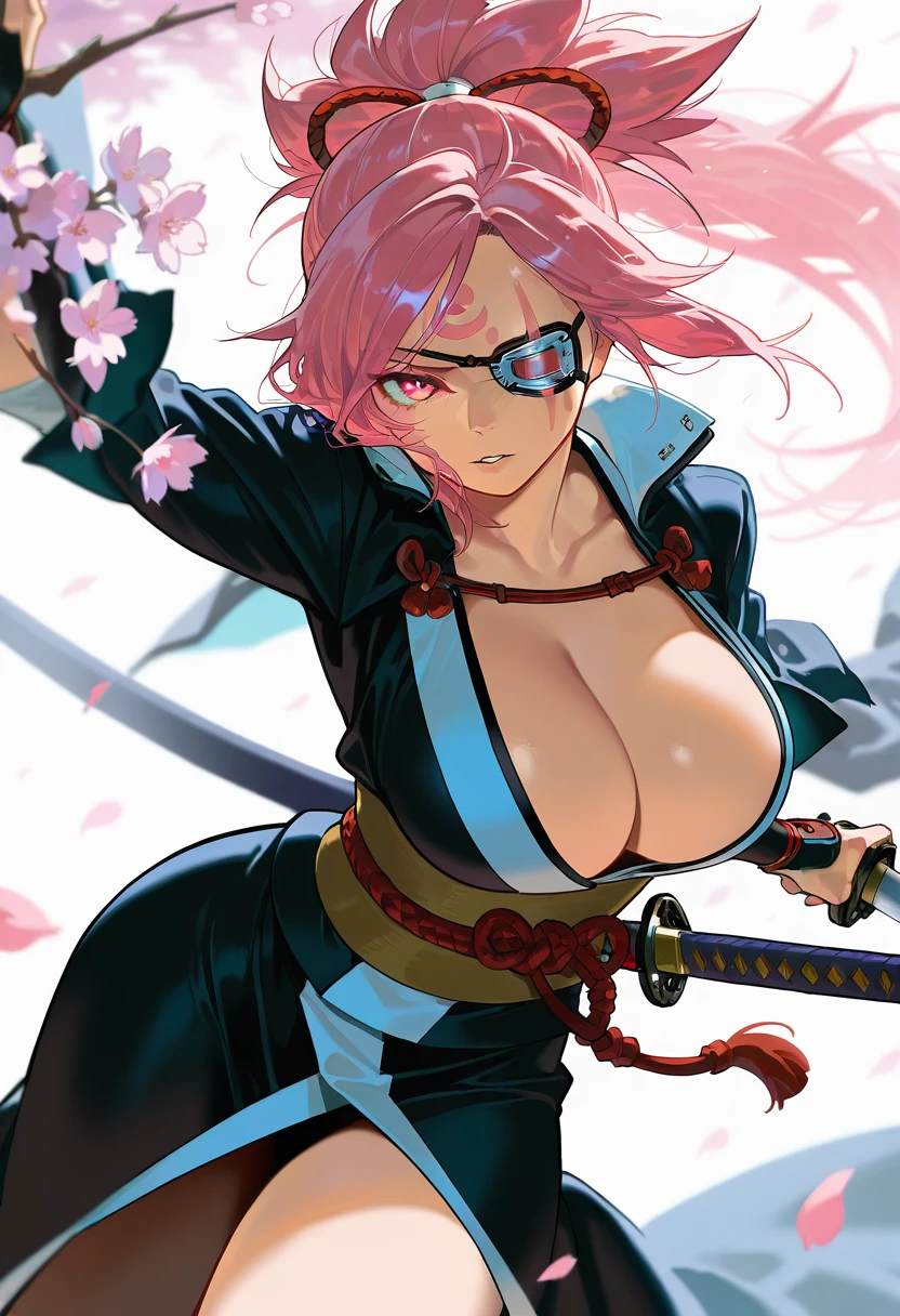 "BKNGG, pink hair, big hair, scar across eye, pink eyes, eyepatch, facial tattoo, large breasts, japanese clothes, kimono, sash"