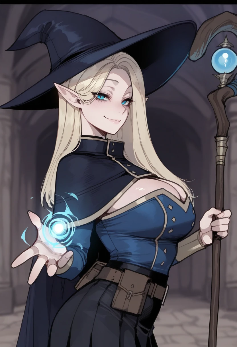 blue dress, cleavage, dark blue capelet, belt pouch, black skirt, blue skirt, witch hat,
