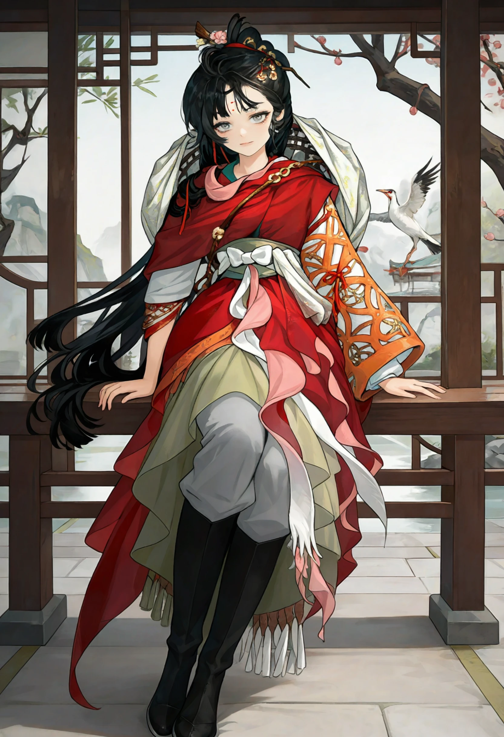 paper heron,black hair,long hair,hair ornament,hair stick,grey eyes,facial mark,forehead mark,jewelry,hanfu,long sleeves,wide sleeves,red rope,sash,shawl,pants,knee boots,black footwear