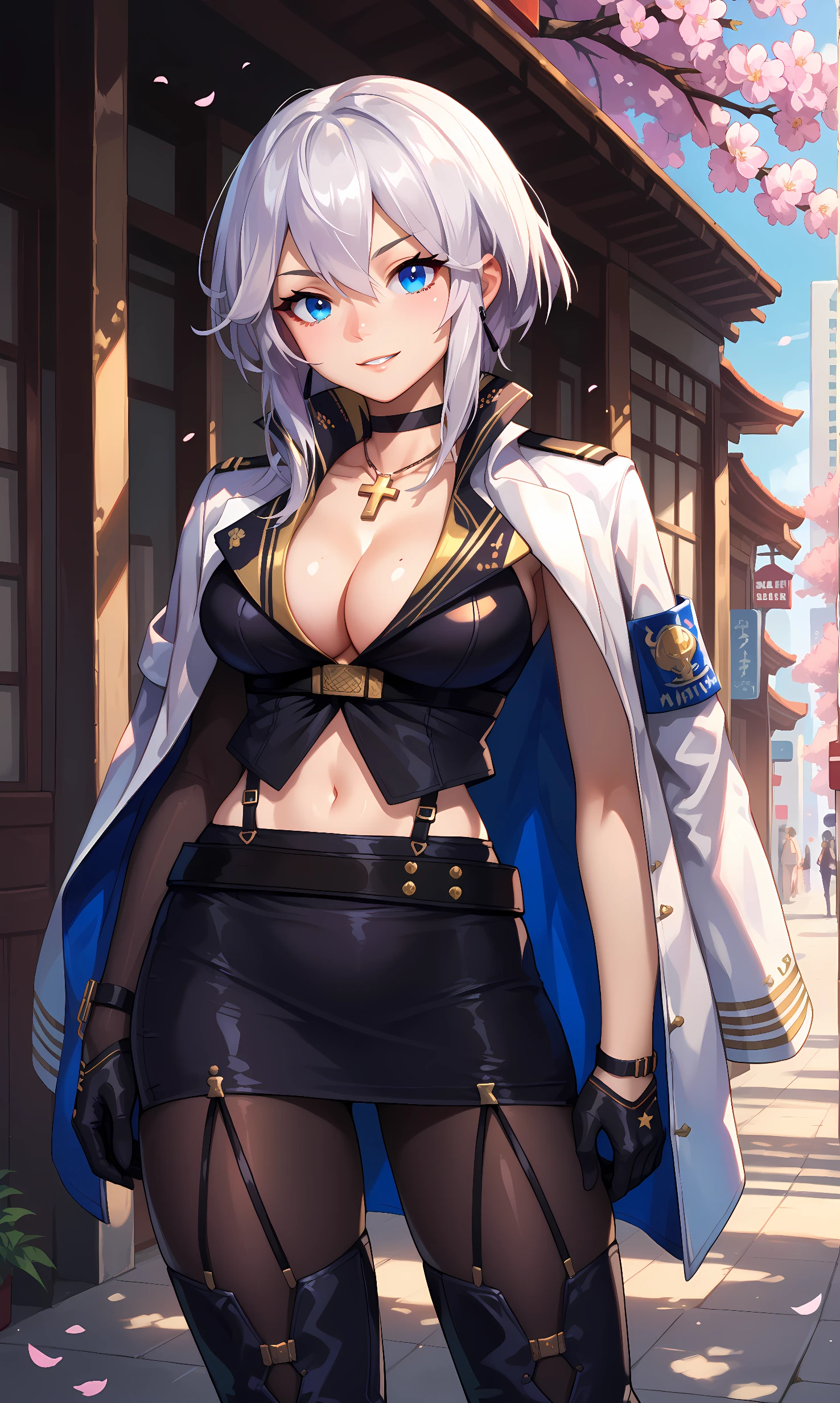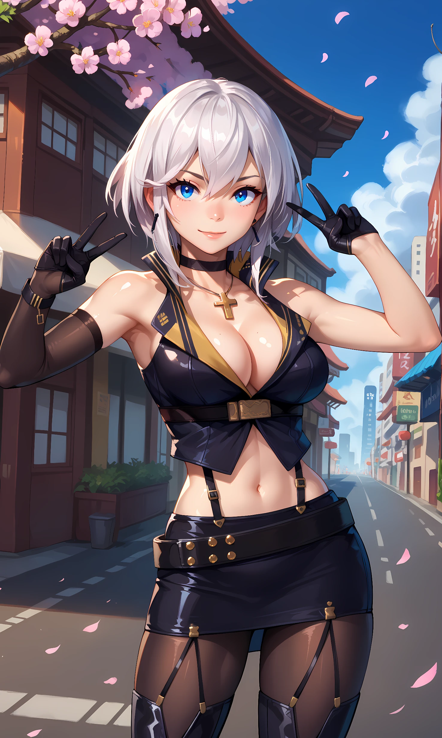 white jacket, jacket on shoulders, single elbow glove, black gloves, choker, cross necklace, black vest, sleeveless vest, cleavage, midriff, black skirt, overall skirt, pencil skirt, garter straps, black pantyhose, black boots, thigh-boots